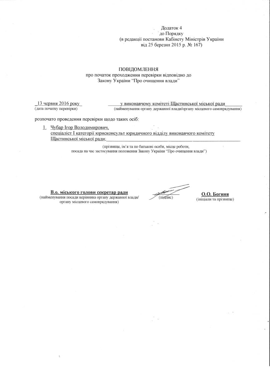 Повідомлення про початок проходження перевірки відповідно до Законоу України "Про очищення влади" Чубар І.В