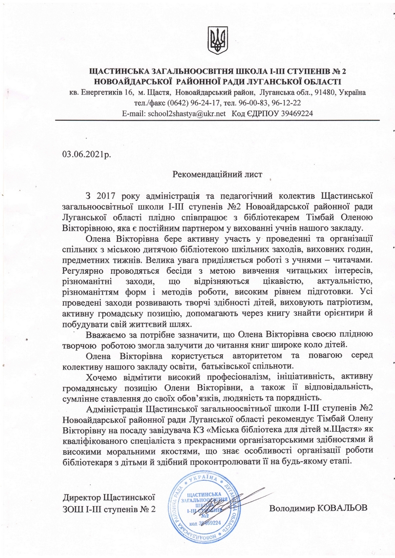 На виконання Закону України «Про внесення змін до деяких законодавчих актів України щодо запровадження контрактної форми роботи у сфері культури та конкурсної процедури призначення керівників державних та комунальних закладів культури» від 28.01.2016 № 955-VIIІ, відділ освіти, культури, молоді та спорту Щастинської міської військово-цивільної адміністрацїї Щастинського району Луганської області оприлюднює подані кандидатами на заміщення вакантної посади завідувача Комунального закладу «Міська бібліотека для дітей м.Щастя» документи.