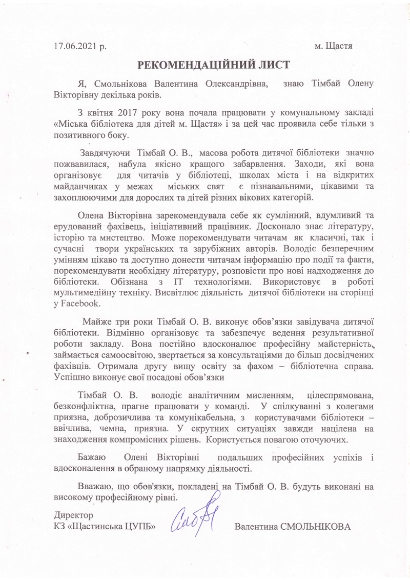 Оприлюднення документів поданих кандидатами на заміщення вакантної посади завідувача Комунального закладу «Міська бібліотека для дітей м.Щастя»