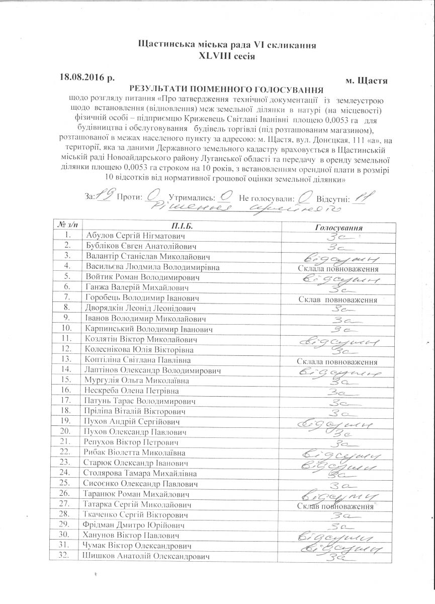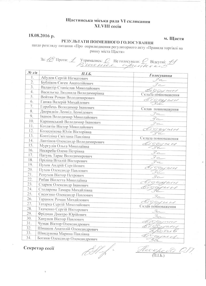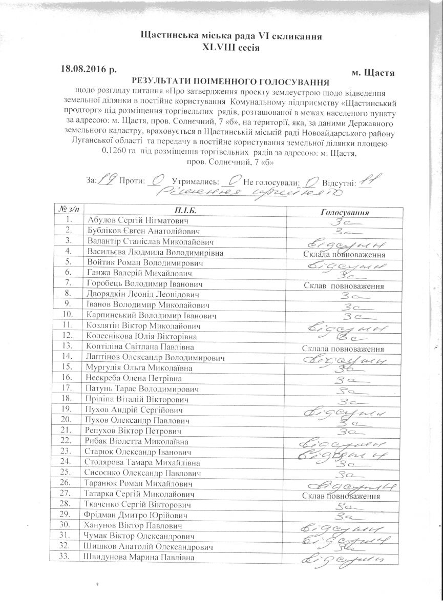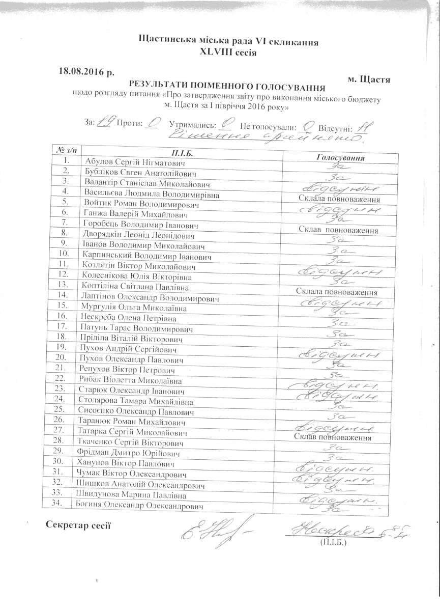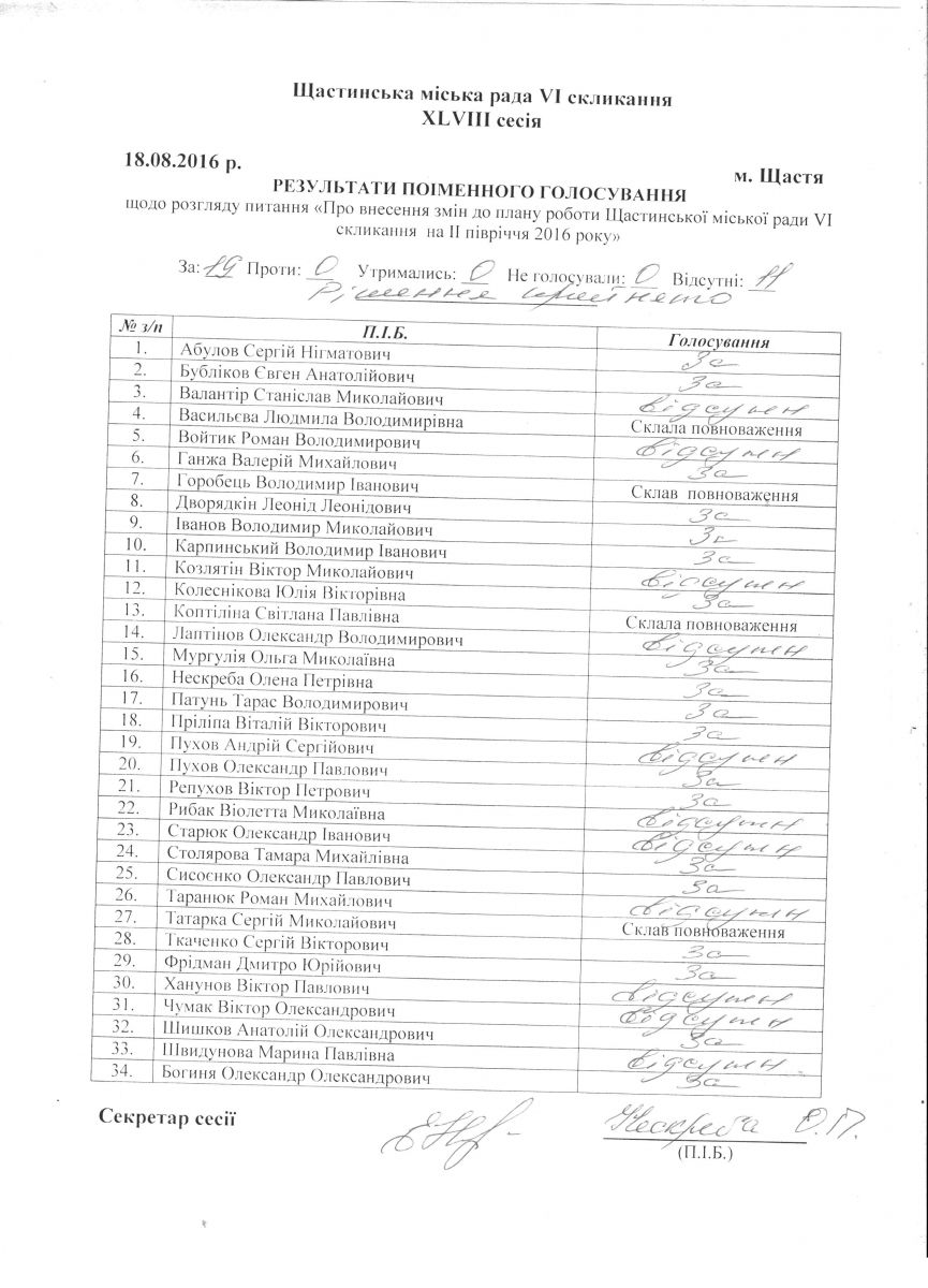 Результати поіменного голосування Щастинської міської ради VI скликання XLVIII сесія