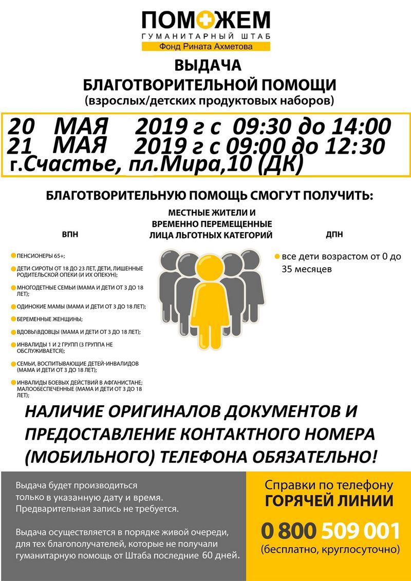 20-21 травня в місті Щастя гуманітарний штаб Фонду Ріната Ахметова надаватиме благодійну допомогу вразливим верствам населення
