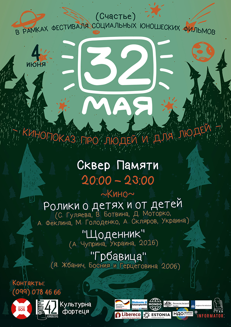 4 червня 2017 року з 20:00 до 23:00 в сквері Пам’яті м. Щастя, в рамках Северодонецького фестивалю соціальних дитячих та юначих фільмів, відбудеться кінопоказ під відкритим небом, присвячений Дню захисту дітей. Захід пройде за ініціативою БО "Благодійний фонд "Восток-СОС" та ГО "Культурна фортеця"