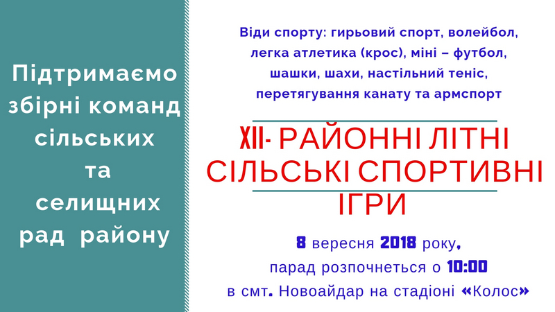 8 вересня 2018 року в смт. Новоайдар на стадіоні «Колос» відбудуться XII- районні літні сільські спортивні ігри