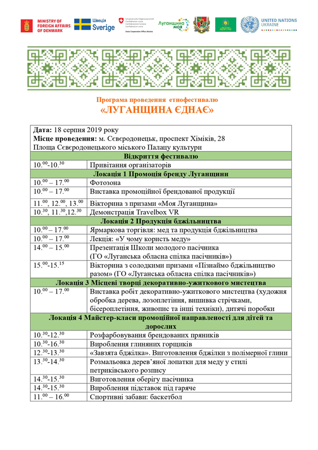 18 серпня 2019 року з 10:00 до 17:00 на території біля КЗ «Сєвєродонецький міський Палац культури» проходитиме етнофестиваль «Луганщина єднає» за ініціативи Департаменту міжнародної технічної допомоги, інноваційного розвитку та зовнішніх зносин Луганської обласної державної адміністрації та Громадської організації «Асоціація бджолярів Луганщини «Медова Артіль» за фінансової підтримки Програми розвитку ООН. Захід відбудеться за участю місцевих творців, виробників сувенірної продукції, творців з обмеженими фізичними можливостями та бджолярів області.
