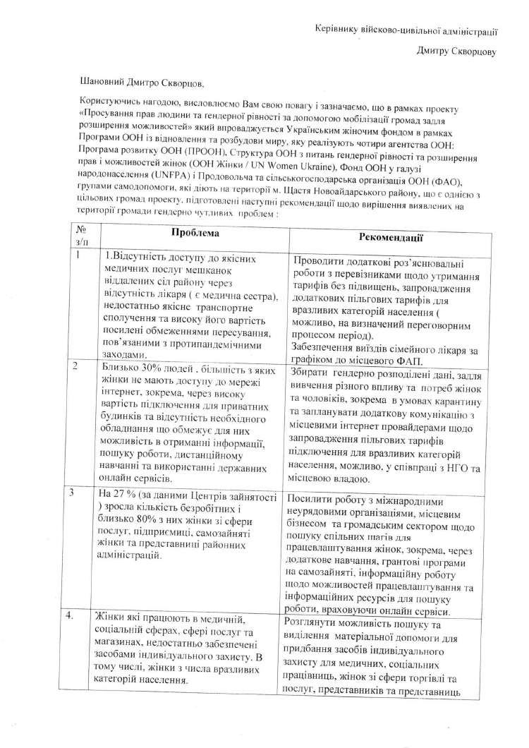 Наші партнери ООН Жінки,МБФ "Українська фундація громадського здоров'я" та щастинські жіночі групи самопомочі представили документ із виявленою проблематикою щодо гендерно-чутливих ознак громади та відповідних рекомендацій по їх вирішенню.