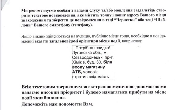 Люди з особливими потребами, зокрема ті, які мають проблеми з слухом та мовленням, можуть викликати “швидку” через смс-повідомлення. Для цього потрібно надіслати повідомлення на номер 0501031776 та вказати ім’я та прізвище людини, до якої викликають “швидку”, причину виклику (симптоми захворювання) та адресу, за якою має виїхати бригада. Послуга діє по всій Луганській області.