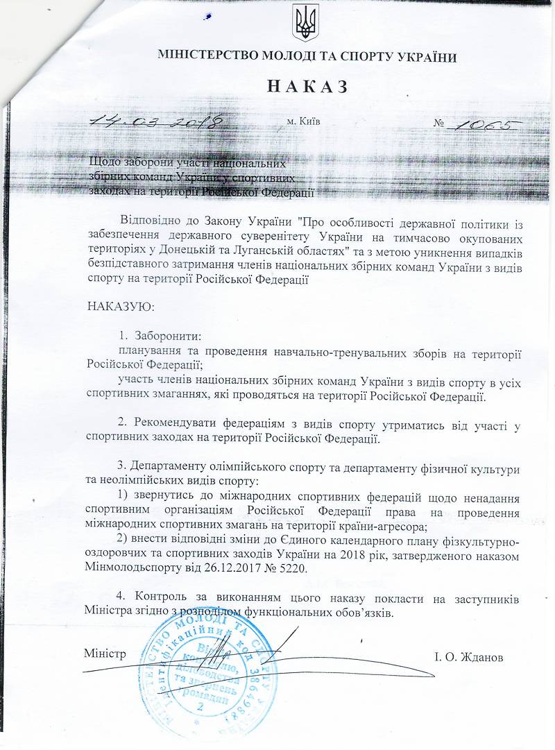 Наказ щодо заборони участі національних збірних команд України в спортивних заходах в РФ