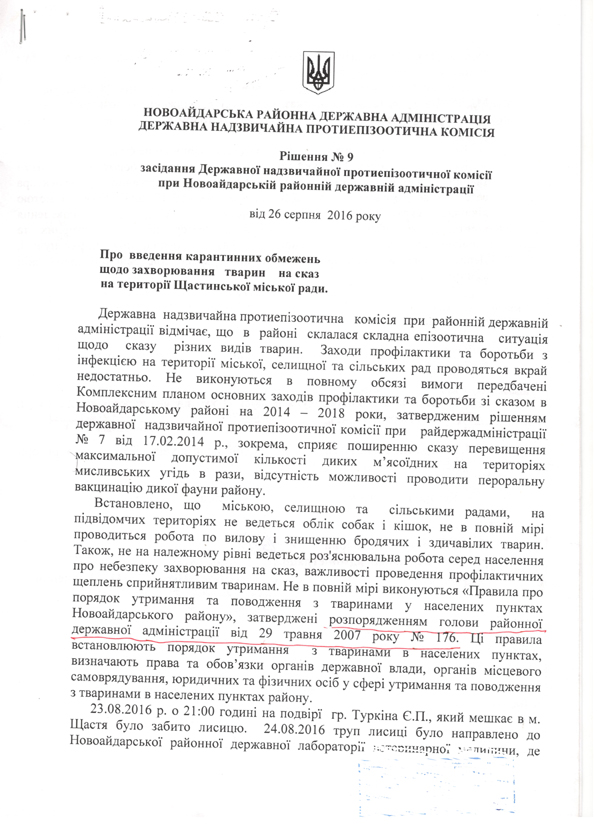 Решением Государственной чрезвычайной противоэпизотической комиссии при Новоайдарской районной государственной администрации №9 от 26.08.2016г. на территории г.Счастье введены карантинные ограничения в связи с выявленным случаем заболевания лисы бешенством.