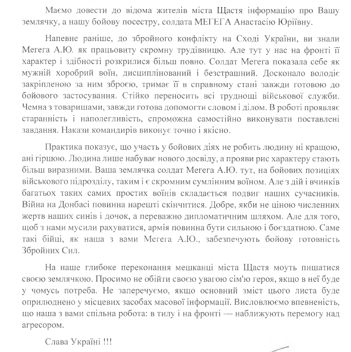 На адресу військово-цивільної адміністрації міста Щастя надійшов лист від командира військової частини з інформацією про нашу землячку Мегега Анастасію Юріївну – солдата та героя Збройних Сил України.