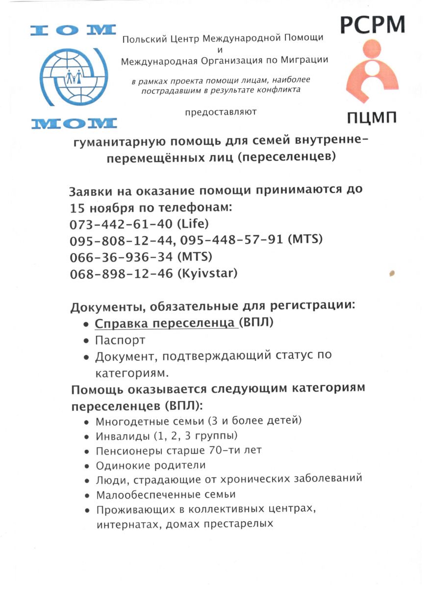 Объявление! Гуманитарная помощь для переселенцев.