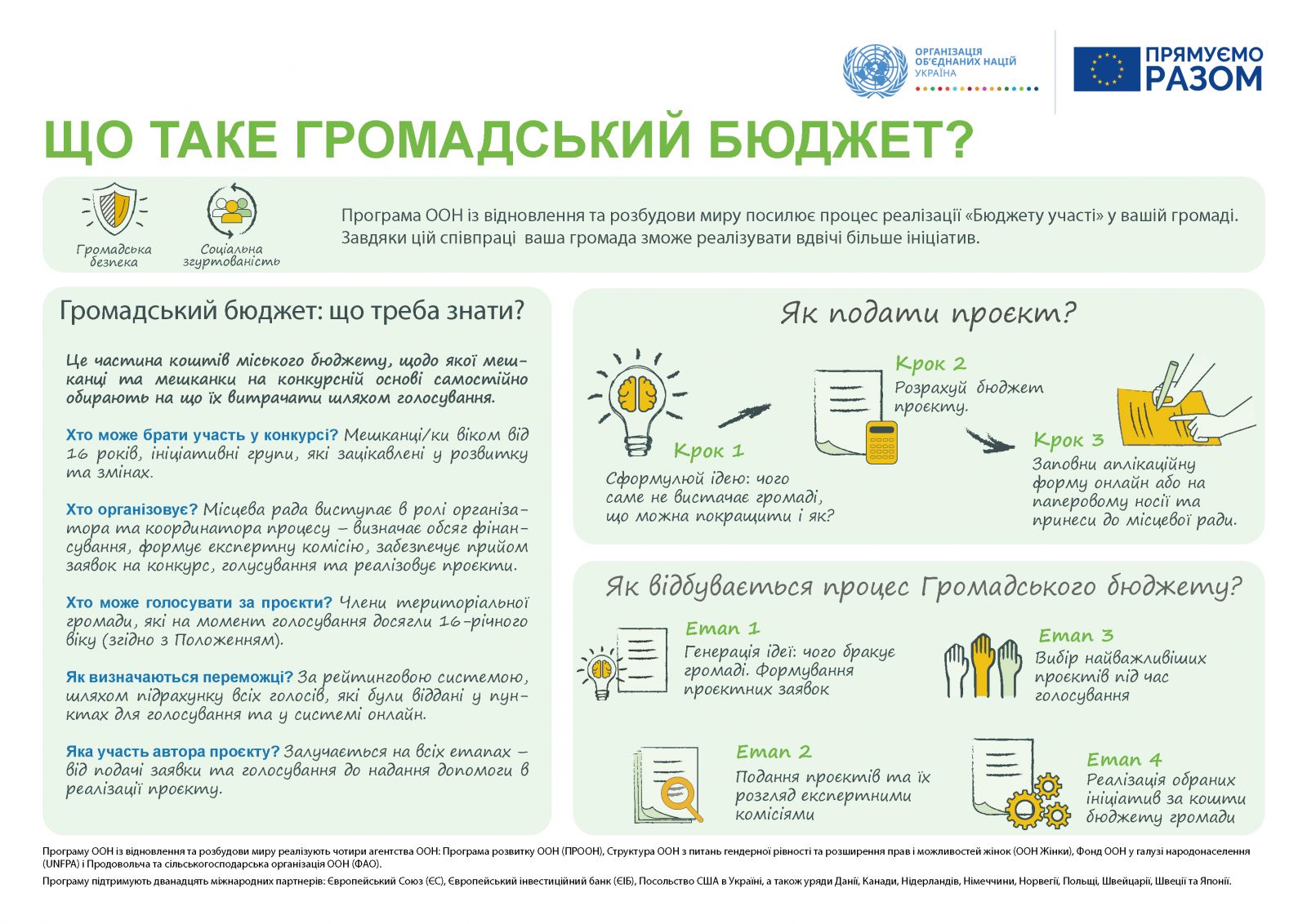 Громадський бюджет – це демократичний процес, який надає можливість кожному громадянину брати участь в розподілі коштів місцевого бюджету через створення проєктів для покращення громади та/або голосування за них.