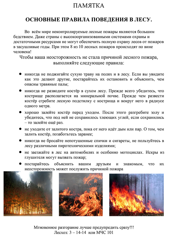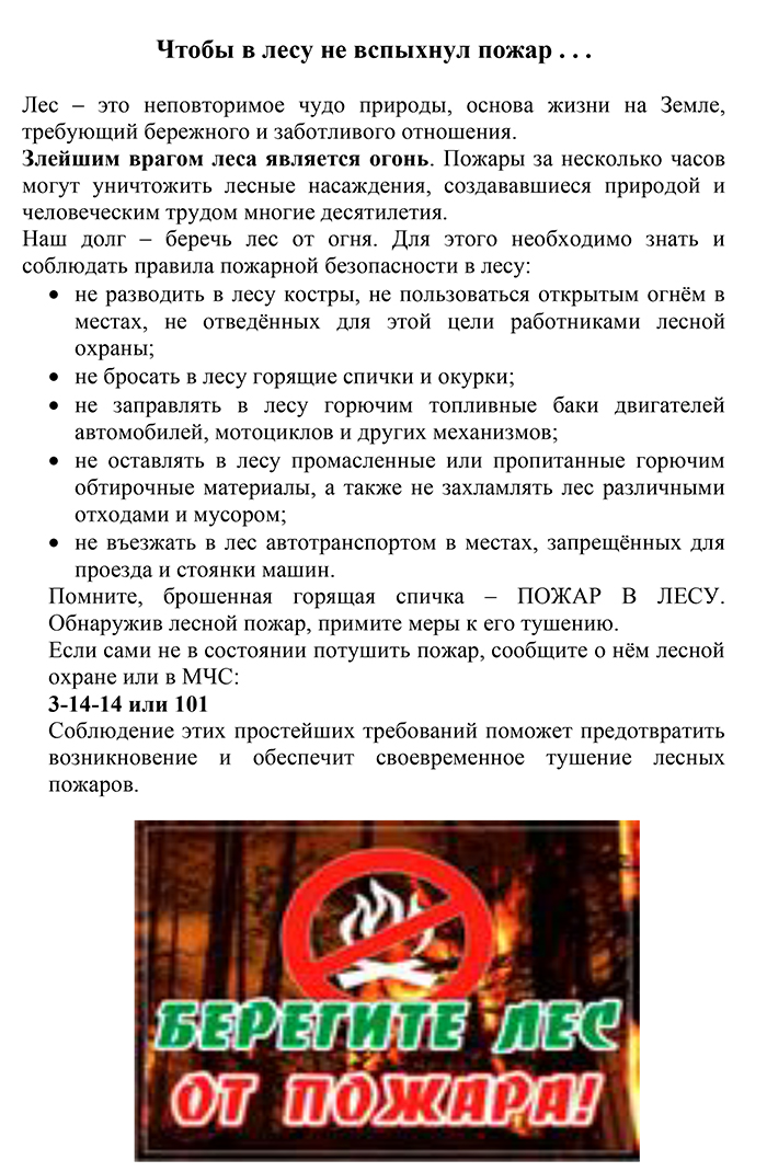 Правила пожежної безпеки в лісі - одні для всіх!Ліс гостинно зустрічає всіх, хто шукає в ньому відпочинку, проте, він вимагає дбайливого до себе ставлення. Розумне користування дарами природи — невід’ємне право людини. Величезної шкоди лісам завдають лісові пожежі. Це страшне лихо не тільки для деревної рослинності, але й для всього живого. Основна причина їх виникнення — порушення протипожежних правил відпочиваючими та іншими людьми, які перебувають у лісі (людська халатність та безвідповідальність, що виявляється у кинутому недопалку, залишеному без догляду чи погано загашеному багатті…).