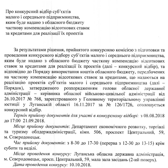 Про конкурсний відбір суб'єктів малого і середнього підприємництва, яким буде надано з обласного бюджету часткову компенсацію...