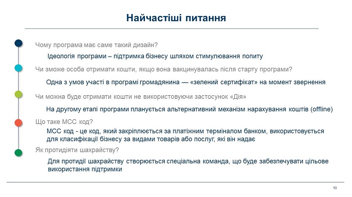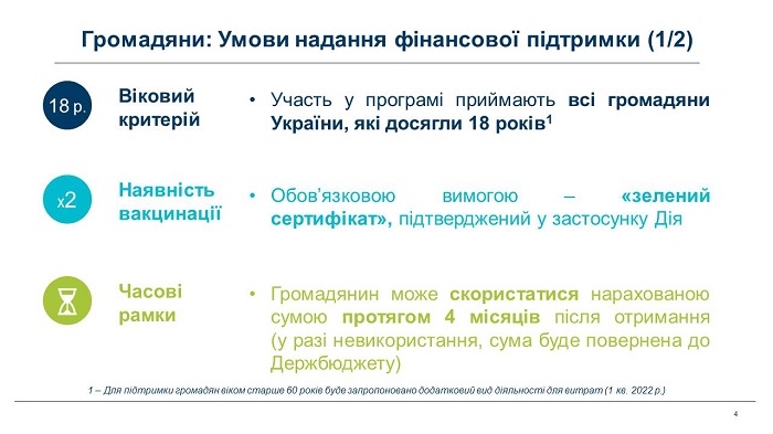 Попередньо Програмою передбачатиметься надання державою підтримки в розмірі 1000 гривень повнолітнім громадянам, що щеплені двома дозами вакцини проти COVID-19. За ці кошти громадяни зможуть придбати абонемент у спортзал чи фітнес-клуб, відвідати кінотеатр, театр, музей, концертний зал або купити квитки для мандрівок усередині країни — на внутрішні авіа- та залізничні рейси.