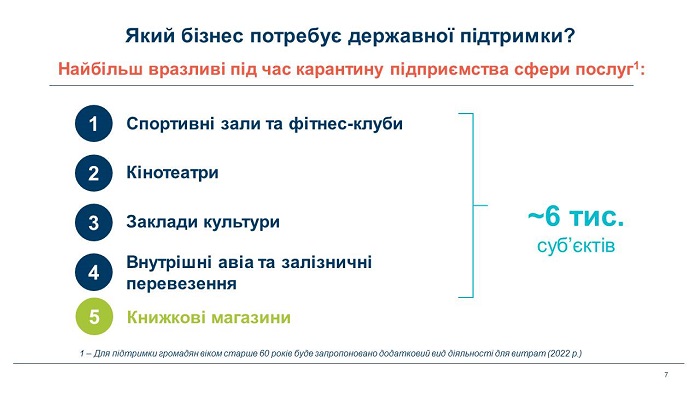 Така Програма дозволить здійснити підтримку сфер діяльності, які постраждали від карантину більше за інших, а саме: заклади культури, заклади фізкультурно-оздоровчого спрямування і внутрішні пасажирські перевезення. У подальшому планується збільшити перелік сфер діяльності.