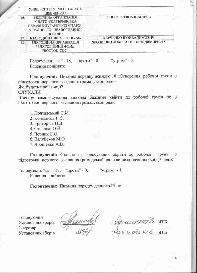 Головуючий: Ставлю на голосування обрати до складу громадської ради при виконавчому комітеті Щастинської міської ради кандидатів по списку 18 чол.