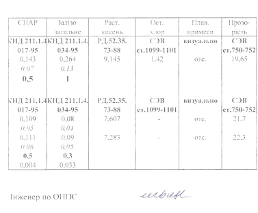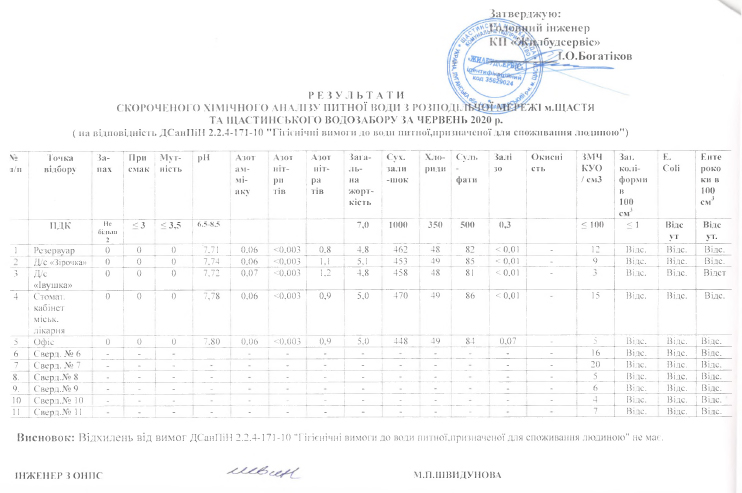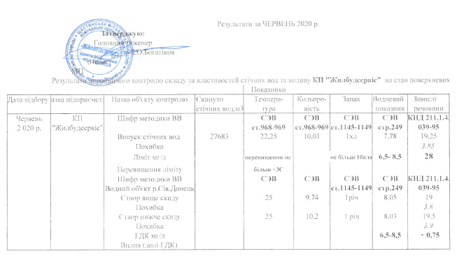 Результати хімічного аналізу питної води та стічних вод за червень 2020 року