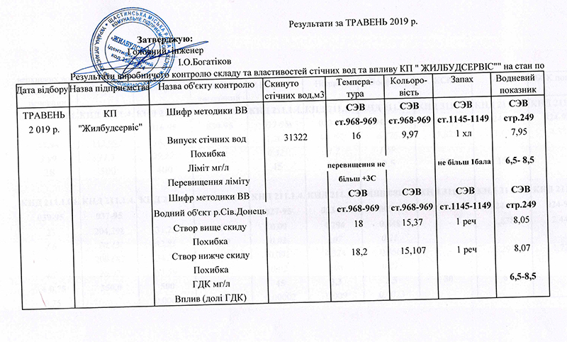 Результати хімічного аналізу питної води та стічних вод за травень 2019 року