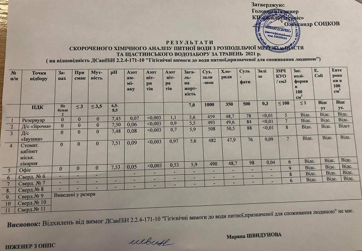 Результати хімічного аналізу питної води та стічних вод за травень 2021 року