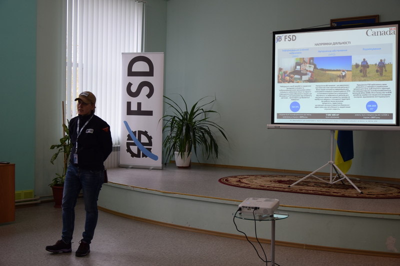 Працівники FSD здійснюють свою діяльність у співпраці з українським урядом для того, щоб очистити території, постраждалі від мін та вибухонебезпечних залишків війни, що необхідно для відновлення та розбудови територій, постраждалих від військового конфлікту. Команда FSD довела статистичні дані до відома слухачів. Так, експерти Швейцарського фонду обслідували 149 2405 m2 на предмет визначення безпечних та небезпечних районів та 236 269 m2 земель було очищено від мін та вибухонебезпечних предметів в 2017 році.