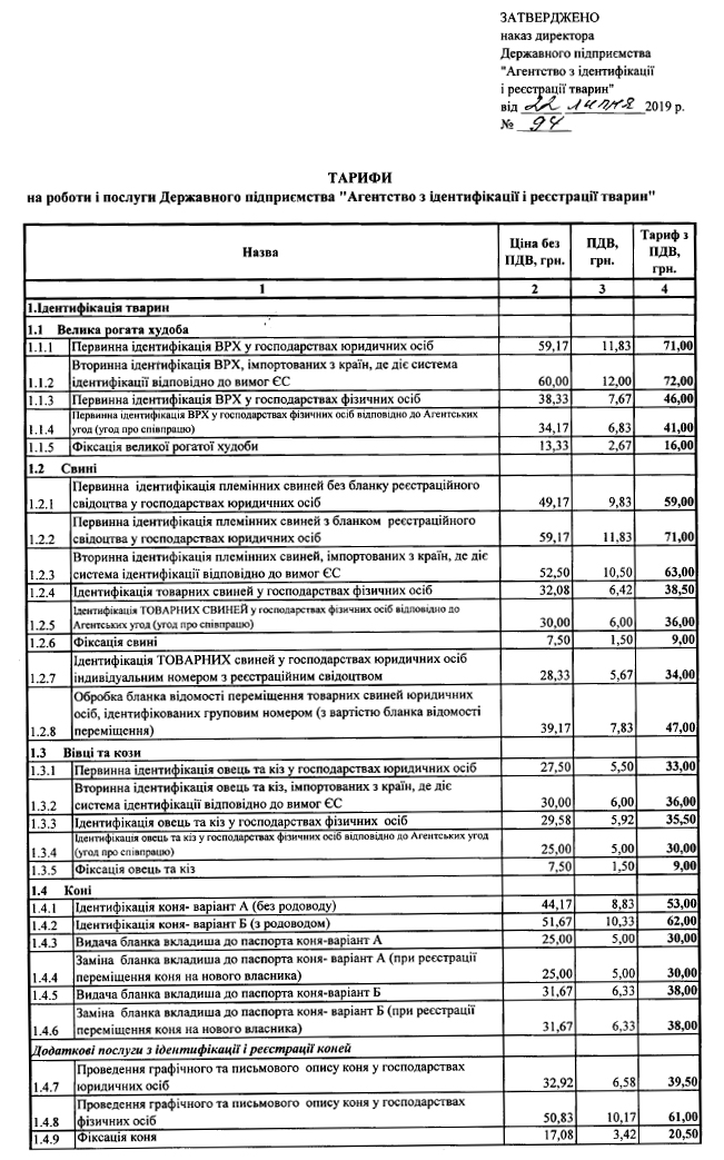 ТАРИФИ на роботи і послуги ДП "Агентство з ідентифікації і реєстрації тварин"