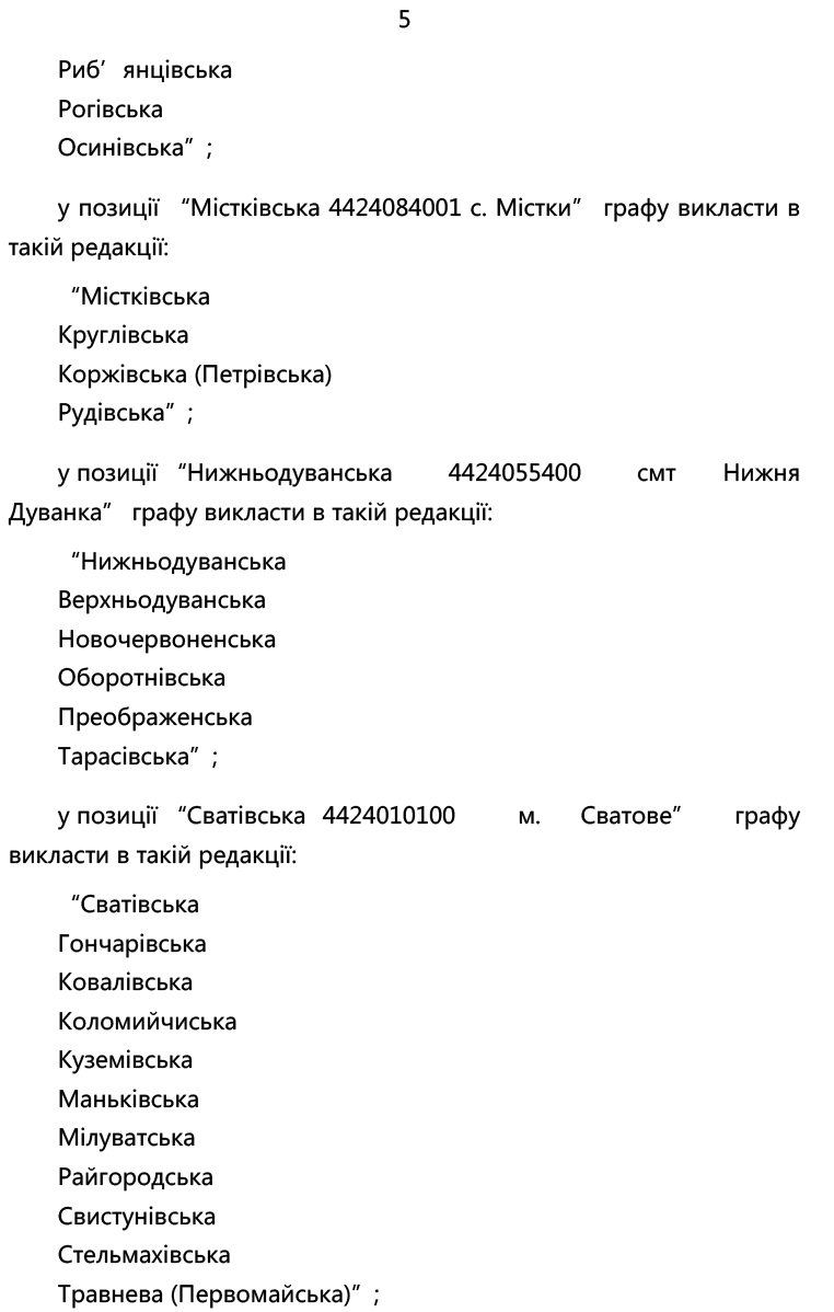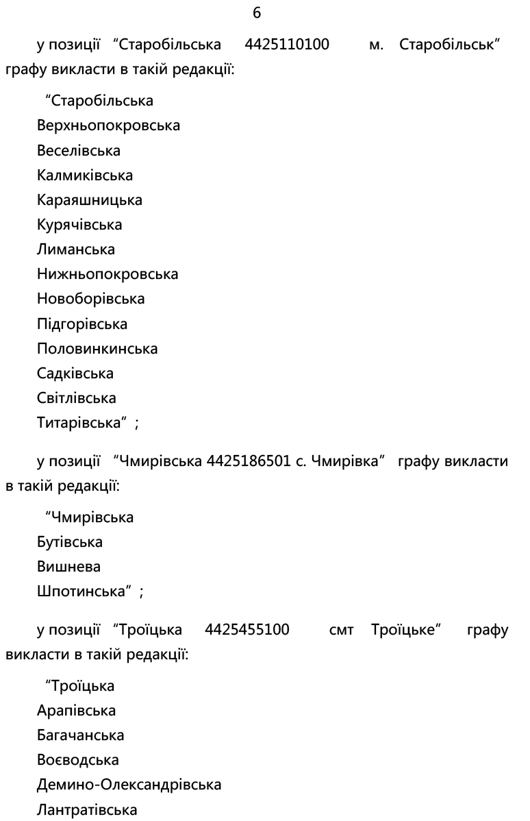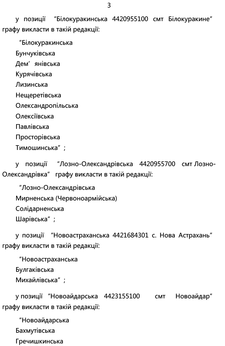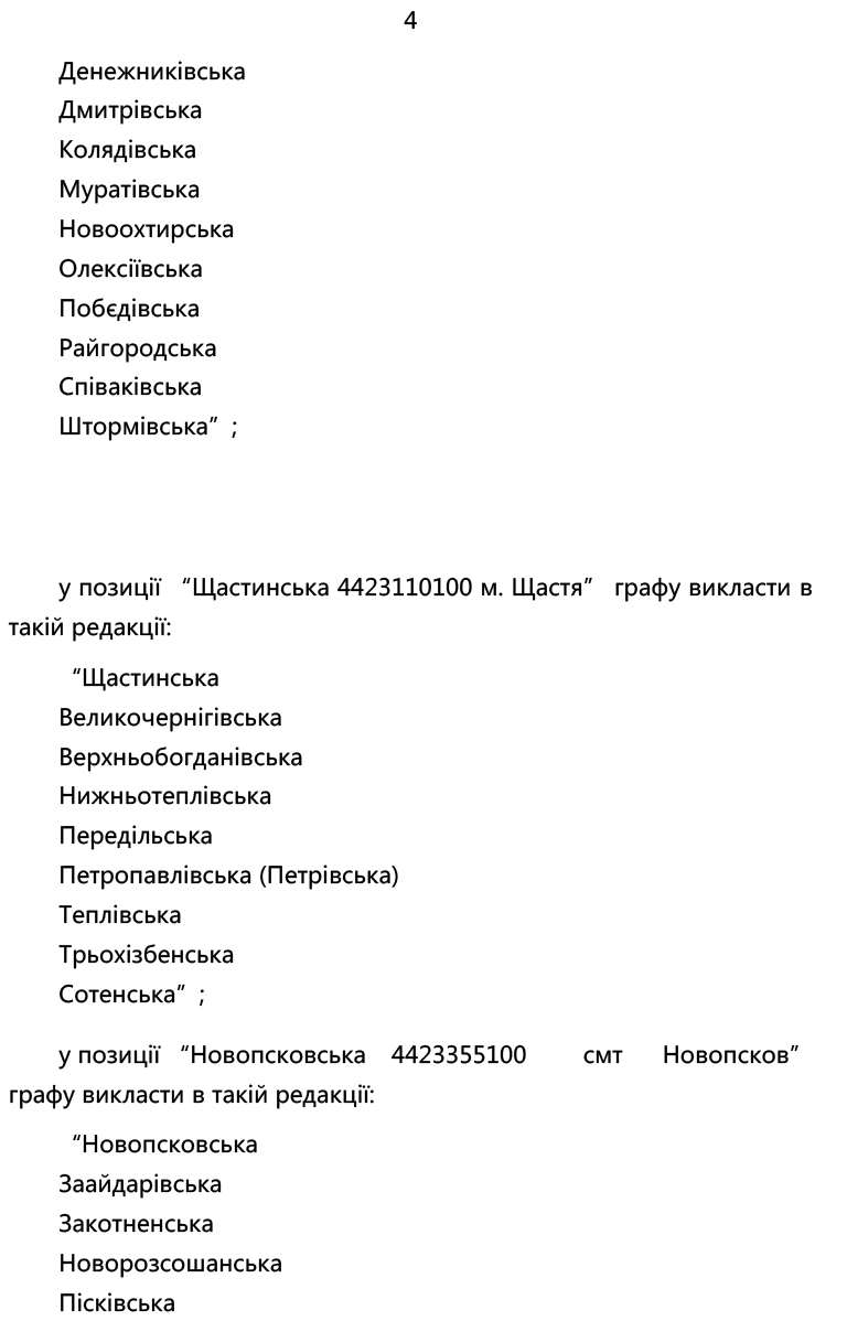 Зазначеними змінами уточнено склад Білокуракинської, Лозно-Олександрівської, Новоастраханської, Новоайдарської, Щастинської, Новопсковської, Містківської, Нижньодуванської, Сватівської, Старобільської, Чмирівської, Троїцької, Лисичанської та Сєвєродонецької громад.