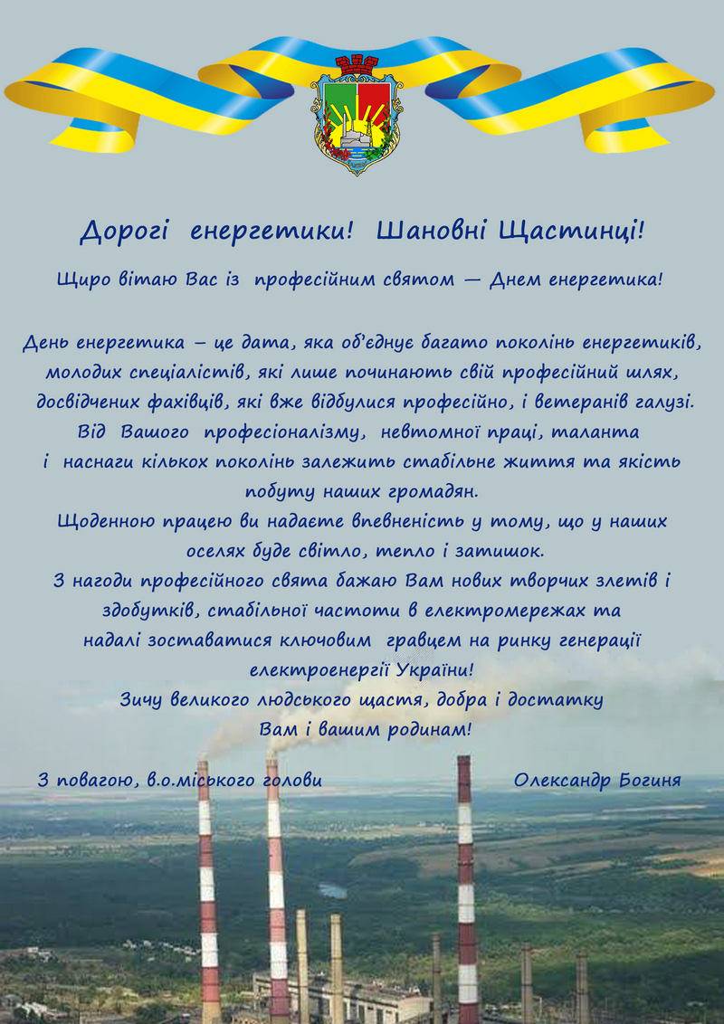Вітання в.о.міського голови, секретаря Щастинської міської ради Олександра Богині із Днем енергетика