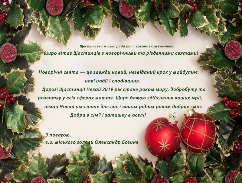 В.о.міського голови О.Богиня вітає Щастинців з новорічними та різдвяними святами