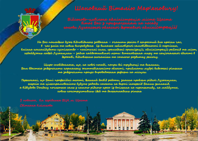 ВЦА міста Щастя вітає Віталія Комарницького з призначенням на посаду голови Луганської обласної державної адміністрації