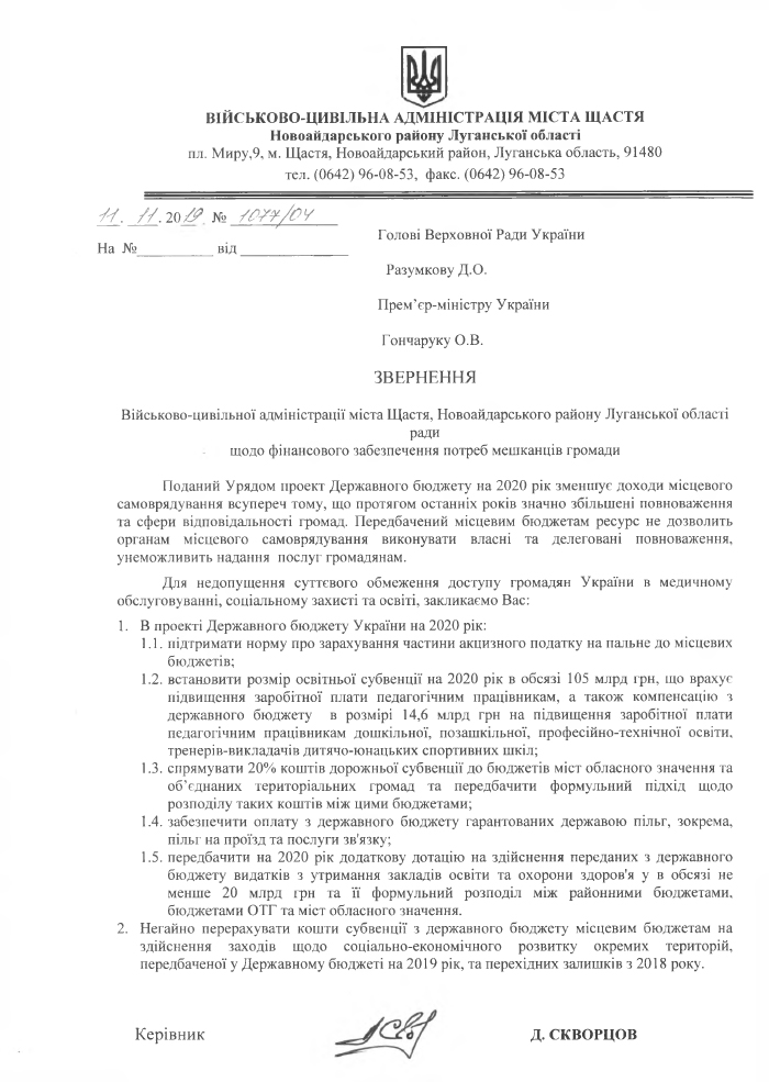 Звернення ВЦА до голови Верховної Ради України щодо фінансового забезпечення потреб мешканців громади
