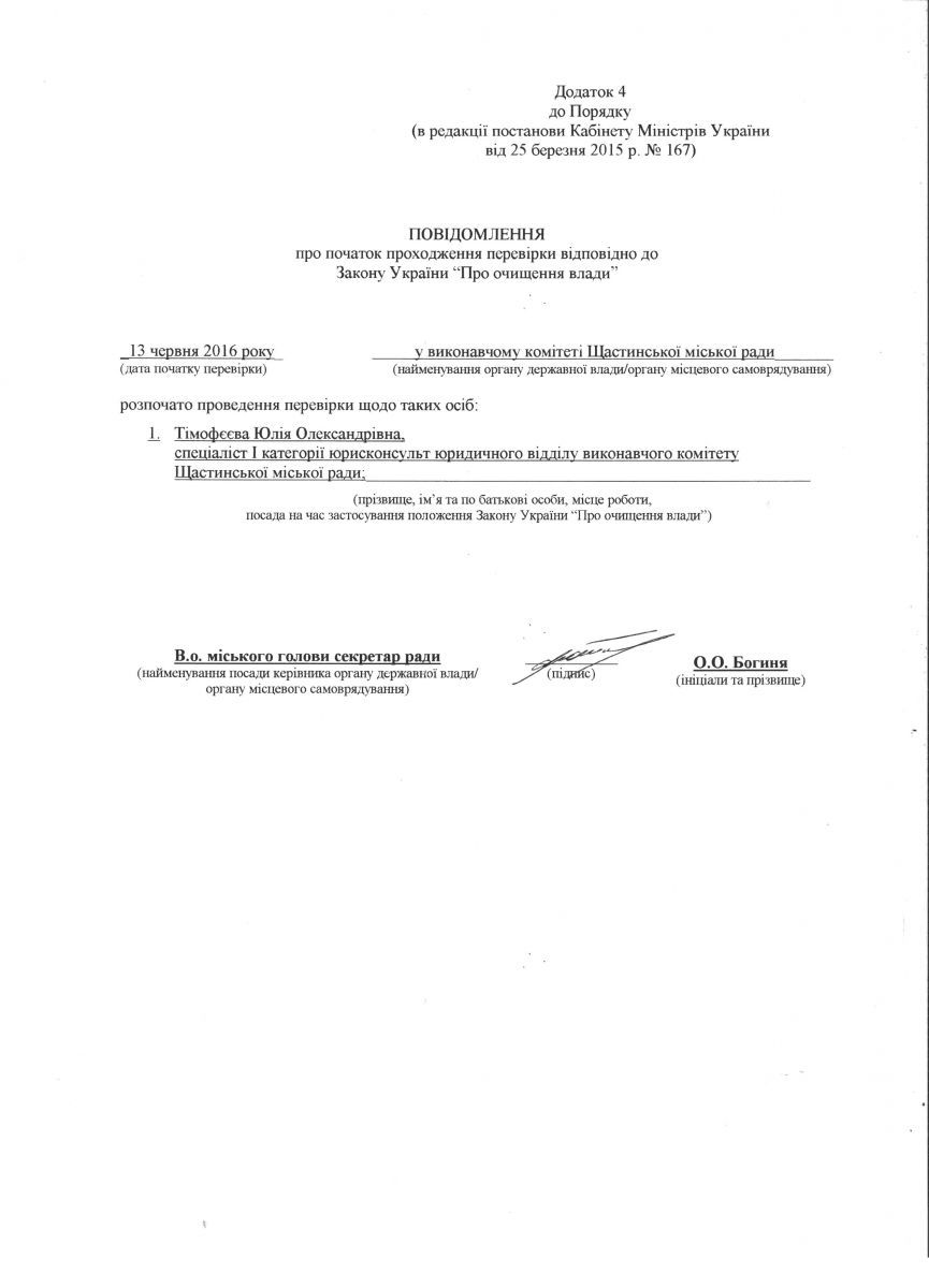 Повідомлення про початок проходження перевірки відповідно до Законоу України "Про очищення влади" Тімофєєва Ю.В