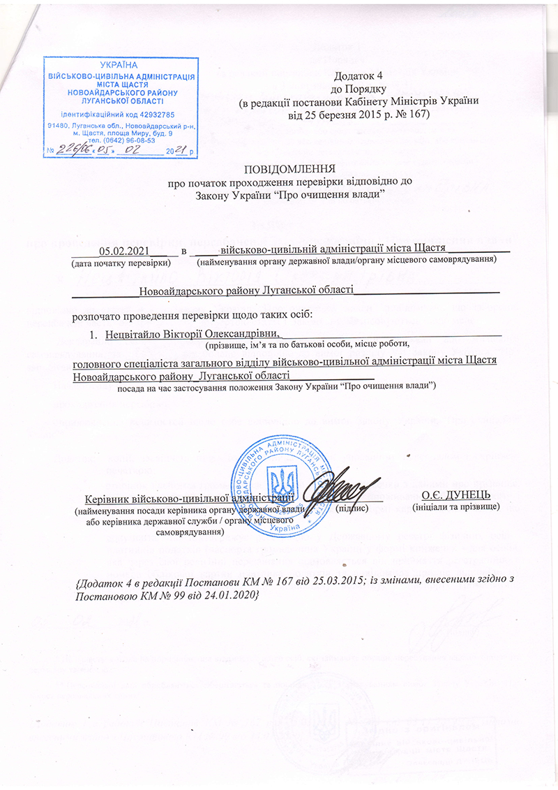 ПОВІДОМЛЕННЯ про початок проходження перевірки відповідно до Закону України “Про очищення влади” НЕЦВІТАЙЛО ВІКТОРІЇ ОЛЕКСАНДРІВНИ