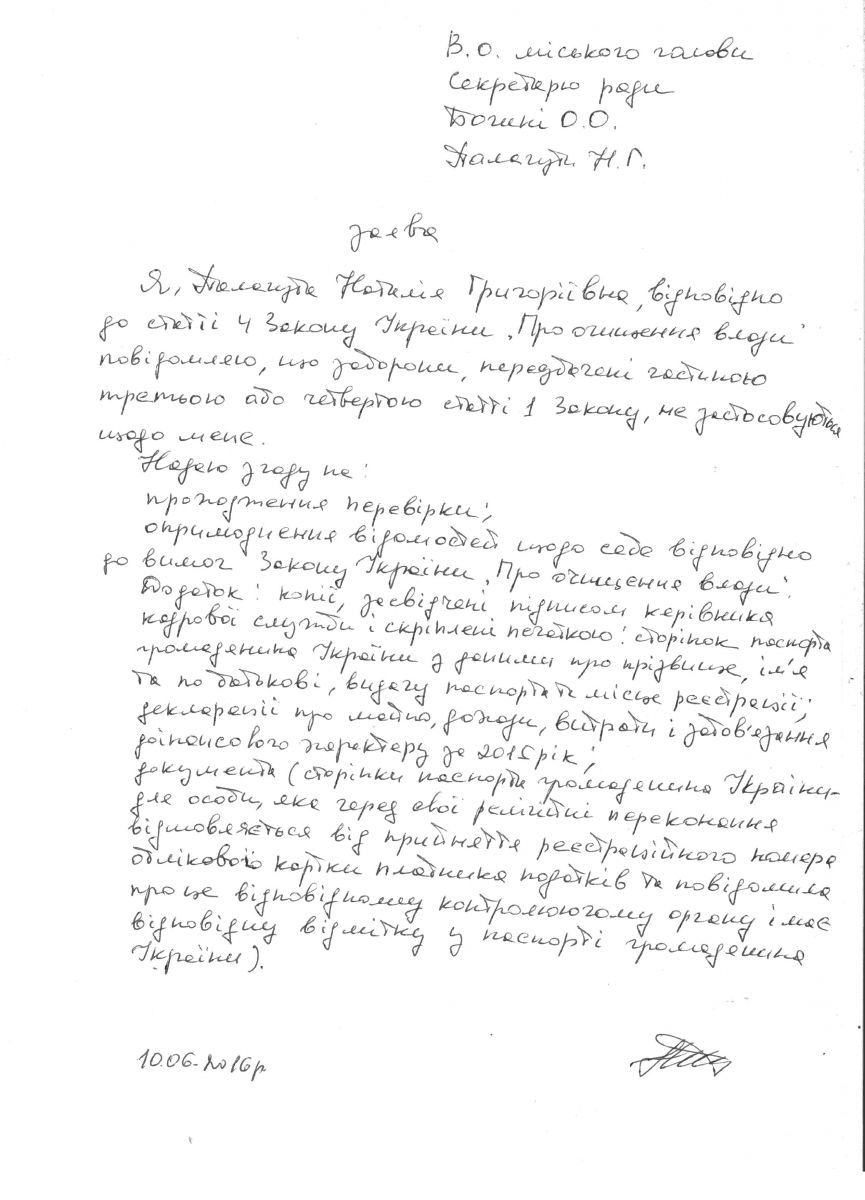 Заява про проведення перевірки, передбаченої Законом України "Про очищення влади" Палагути Н.Г