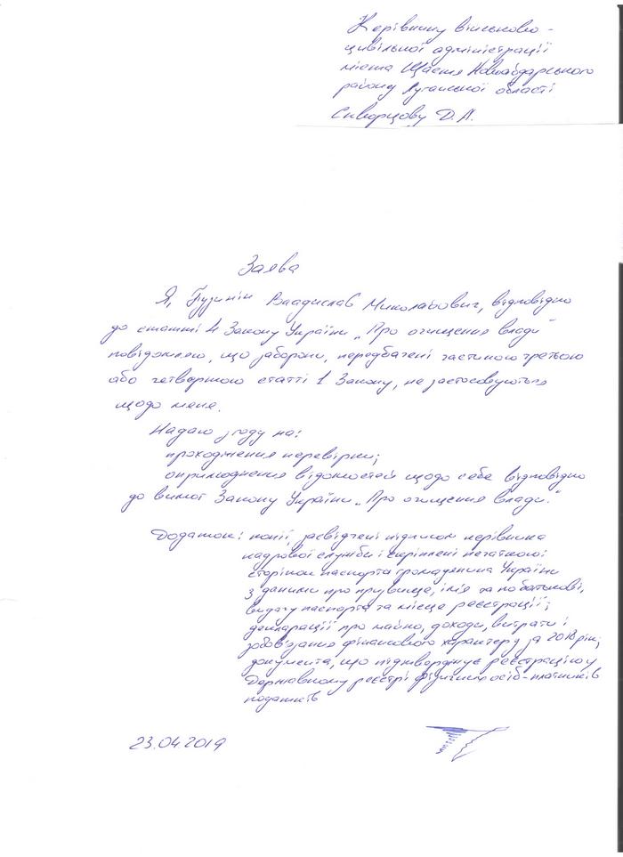 Заява про проведення перевірки, передбаченої Законом України "Про очищення влади" Пузиніна В.М.