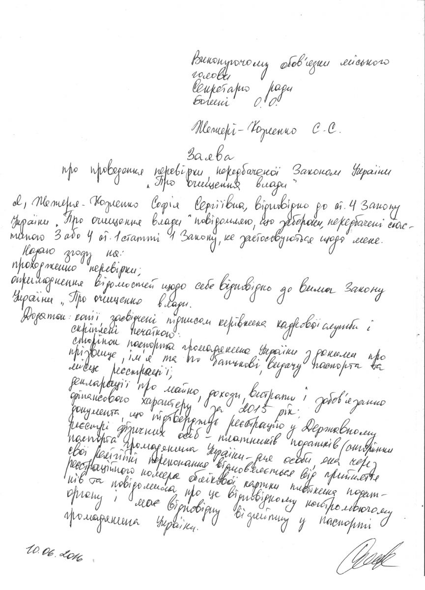 Заява про проведення перевірки, передбаченої Законом України "Про очищення влади" Жежеря-Козленко С.С.