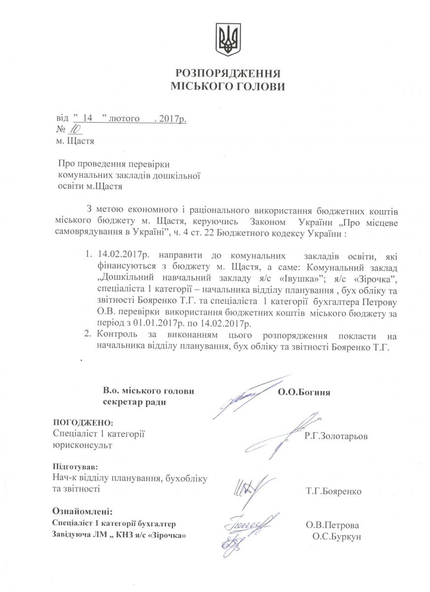 Розпорядження №10 "Про проведення перевірки комунальних закладів дошкільної освіти м.Щастя"