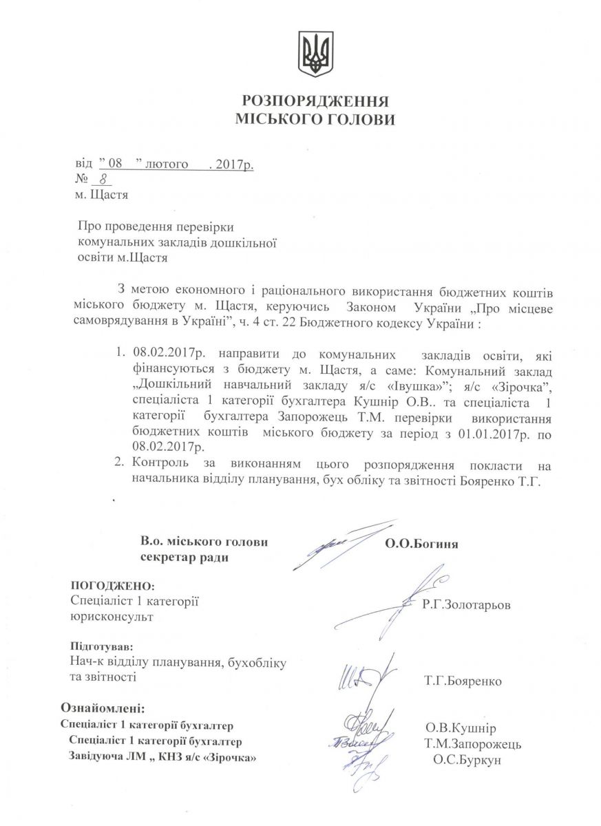 Розпорядження №8 "Про проведення перевірки комунальних закладів дошкільної освіти м.Щастя"