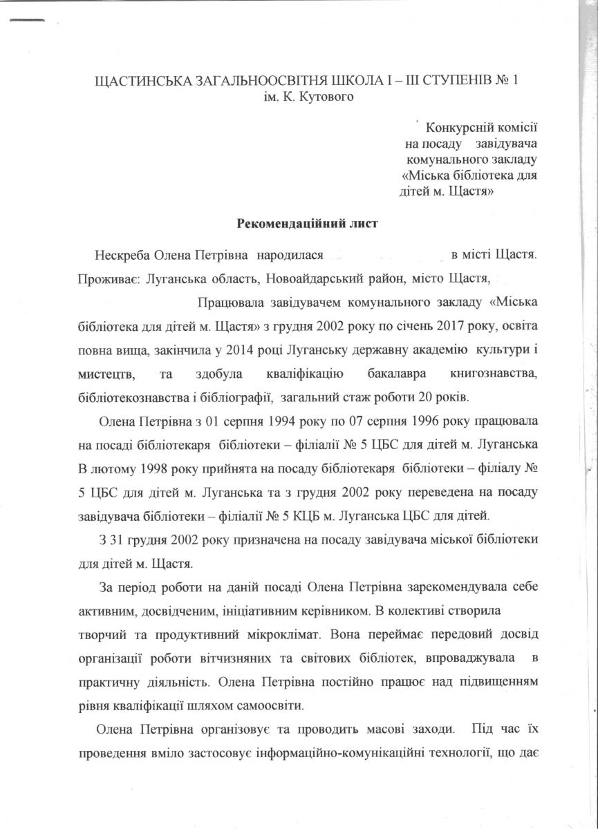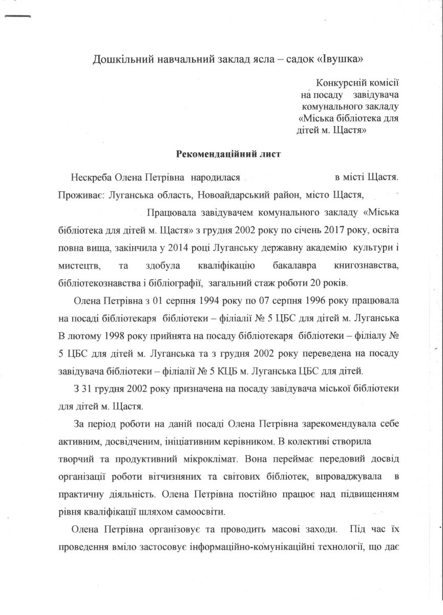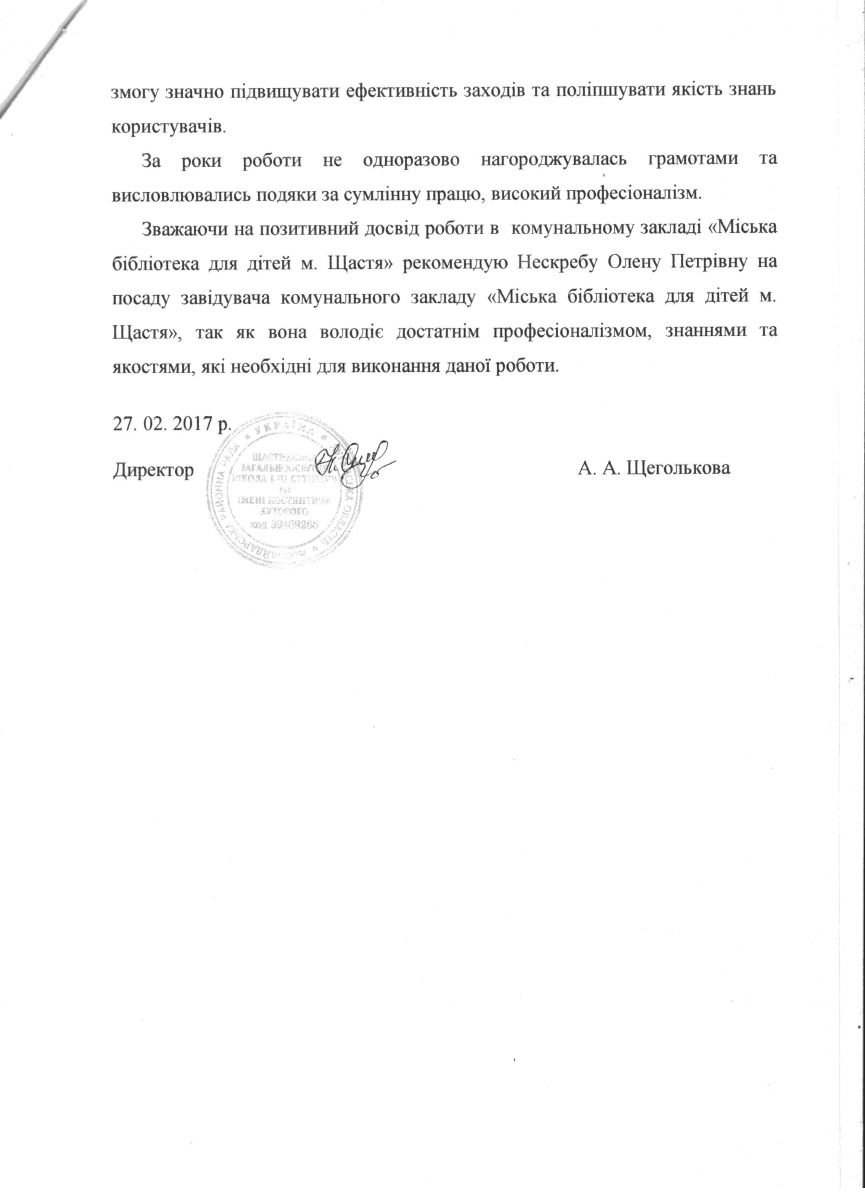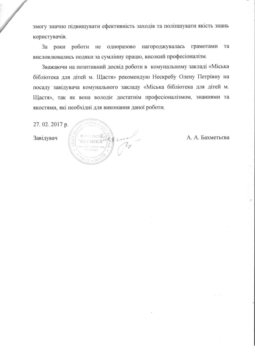 Нескреба О.П. - кандидат на посаду завідувача комунального закладу «Міська бібліотека для дітей»
