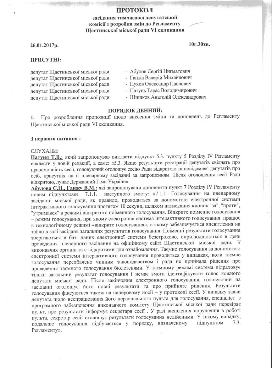 Home › Протокол засідання тимчасової депутатської комісії з розробки змін до Регламенту Щастинської міської ради VI скликання