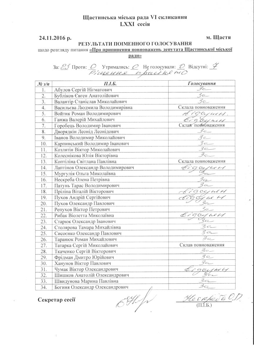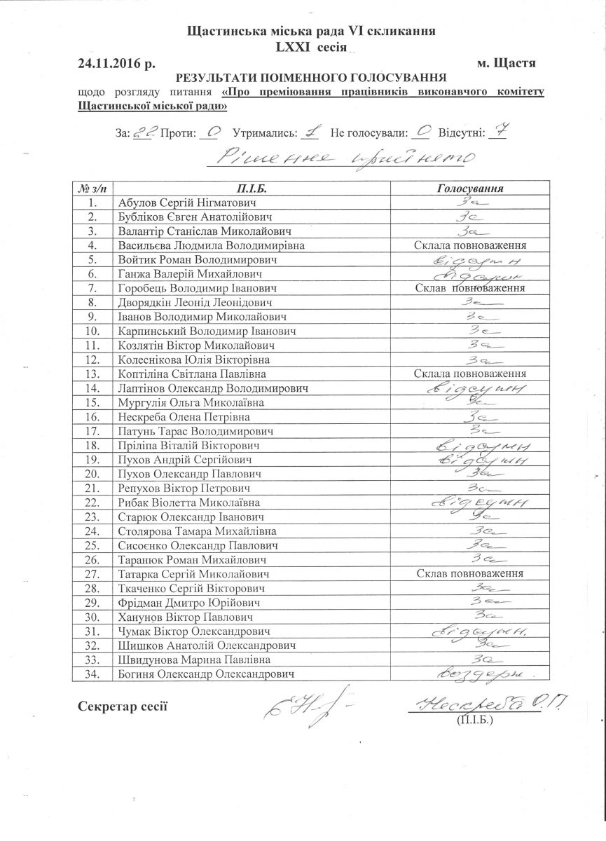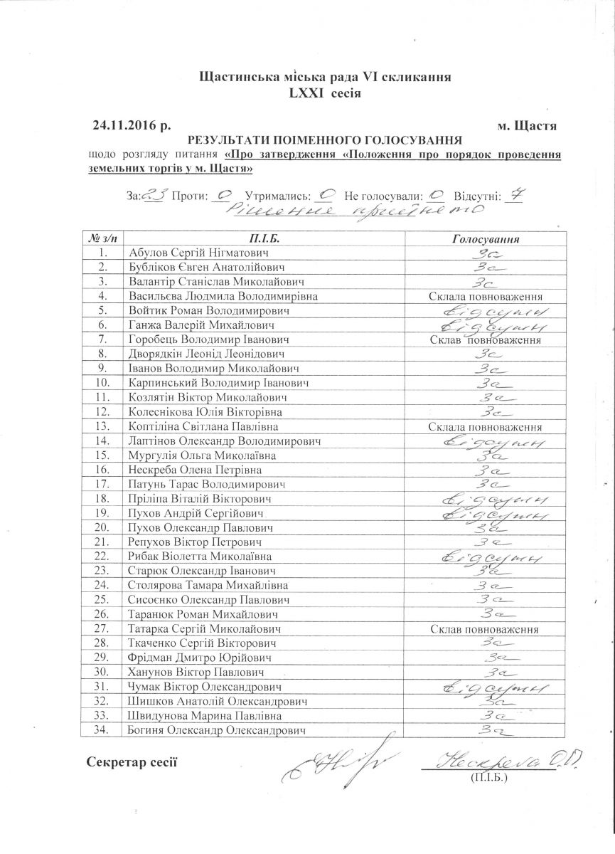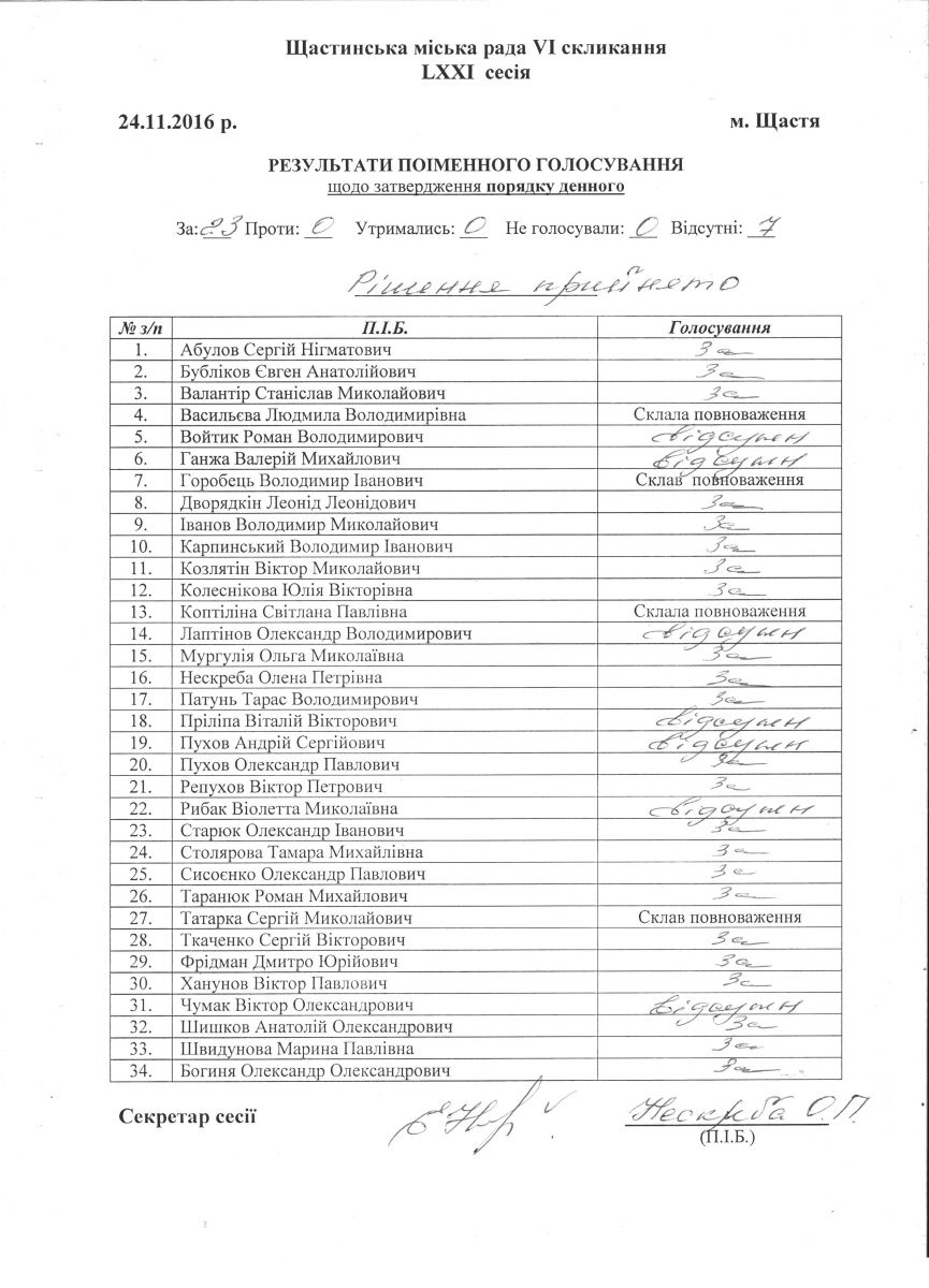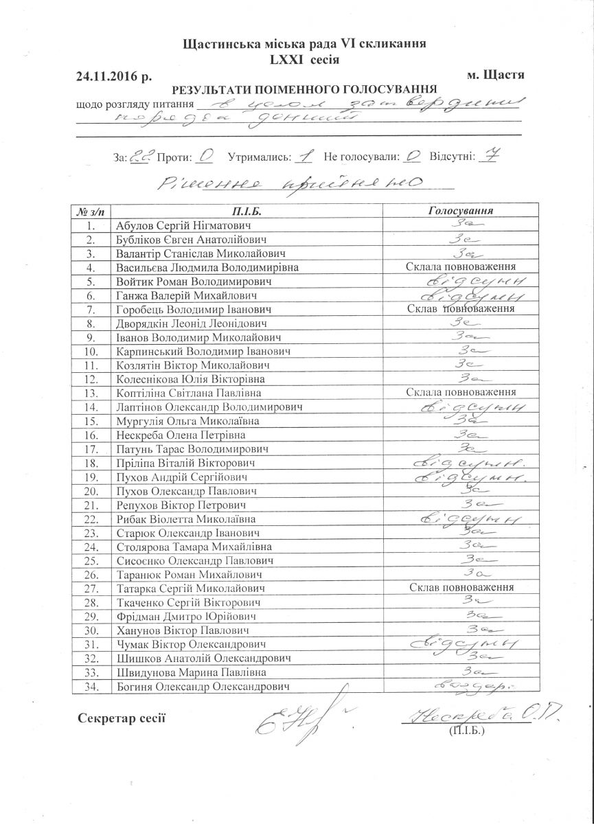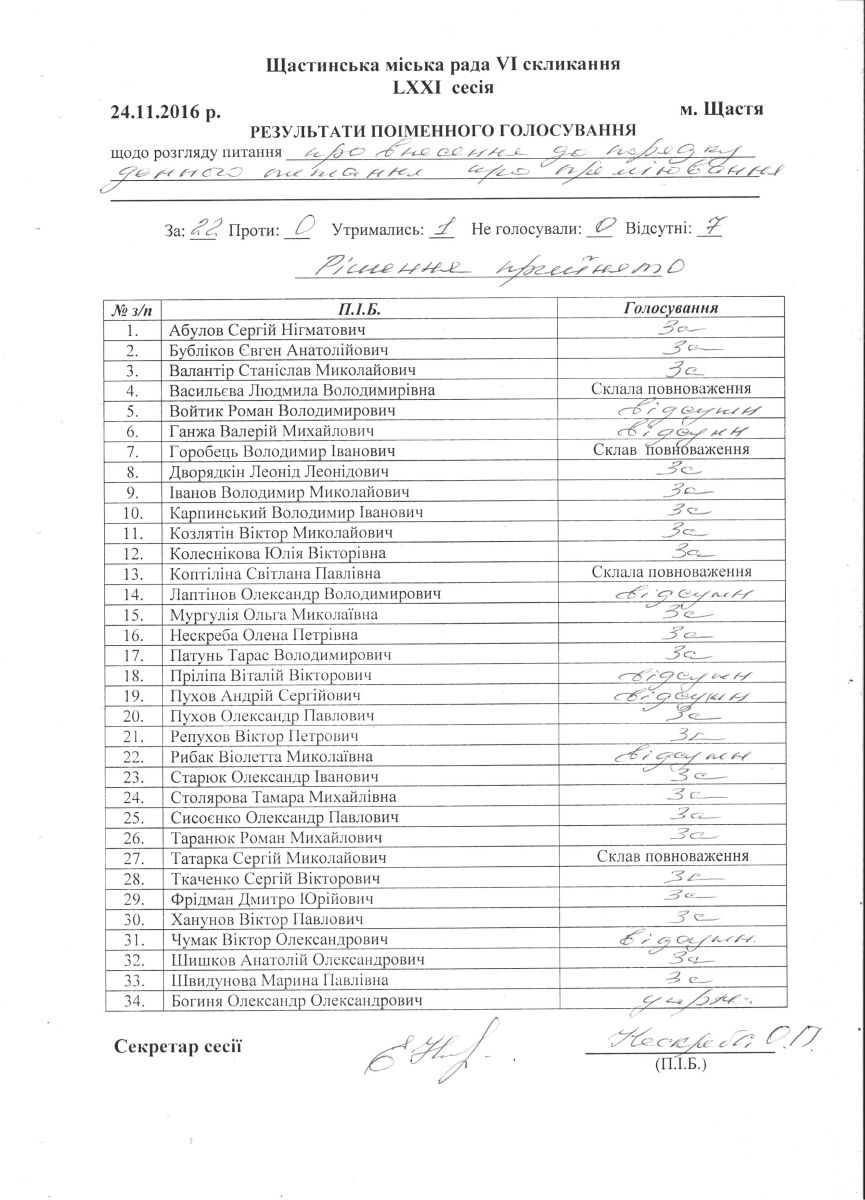 Результати поіменного голосування Щастинської міської ради VI скликання LXXI сесія