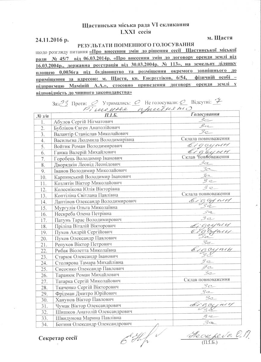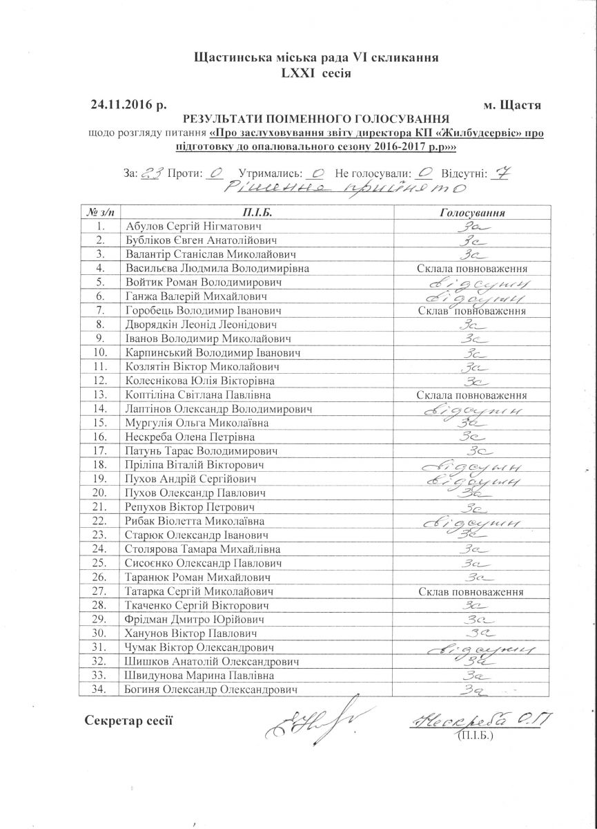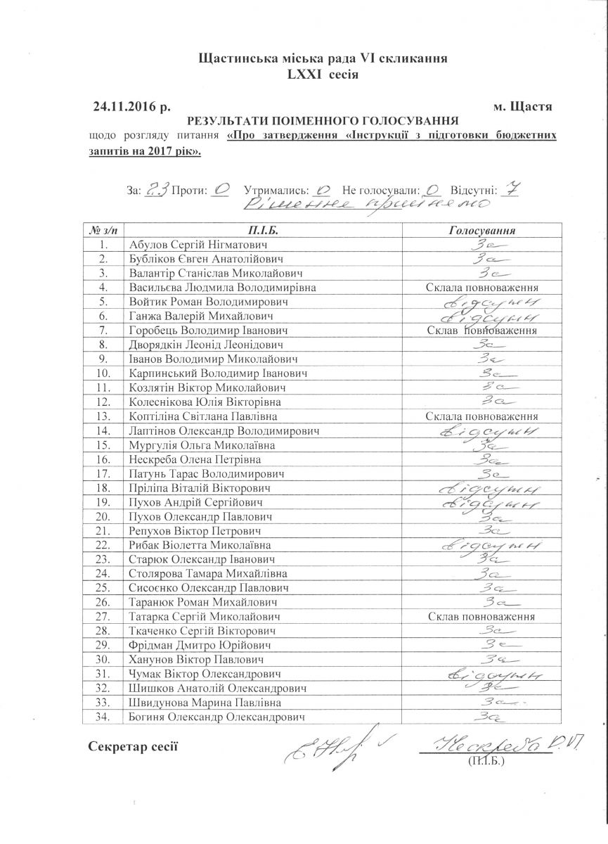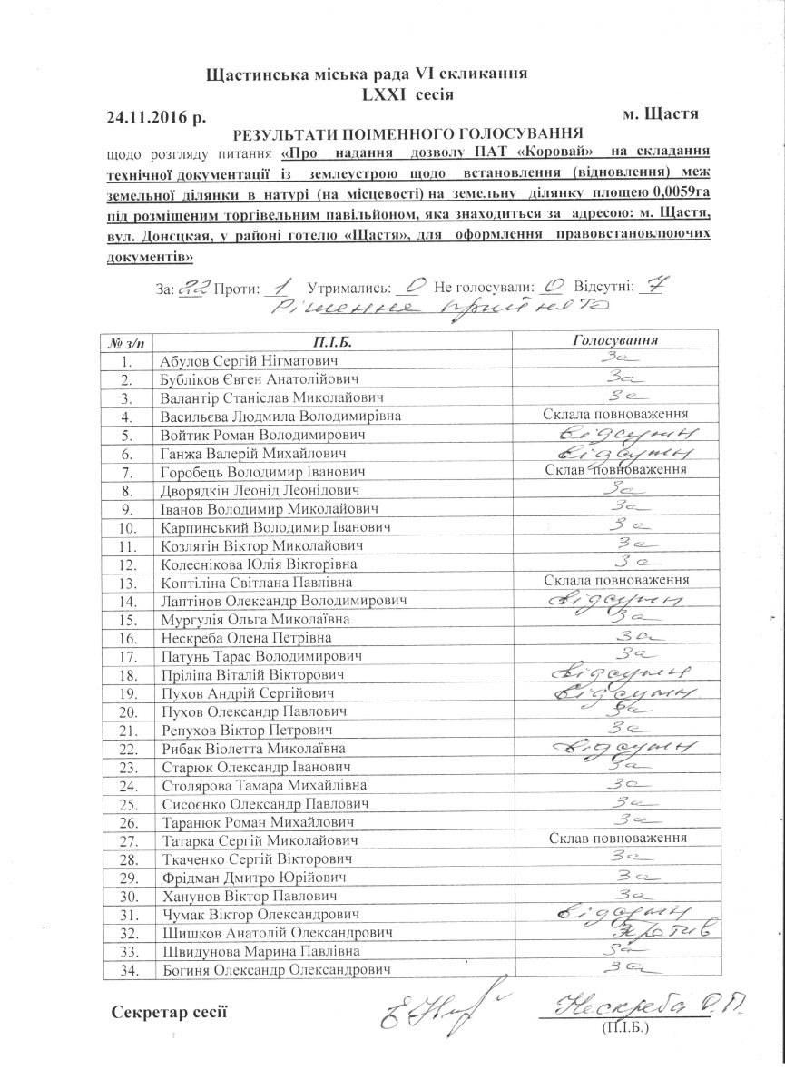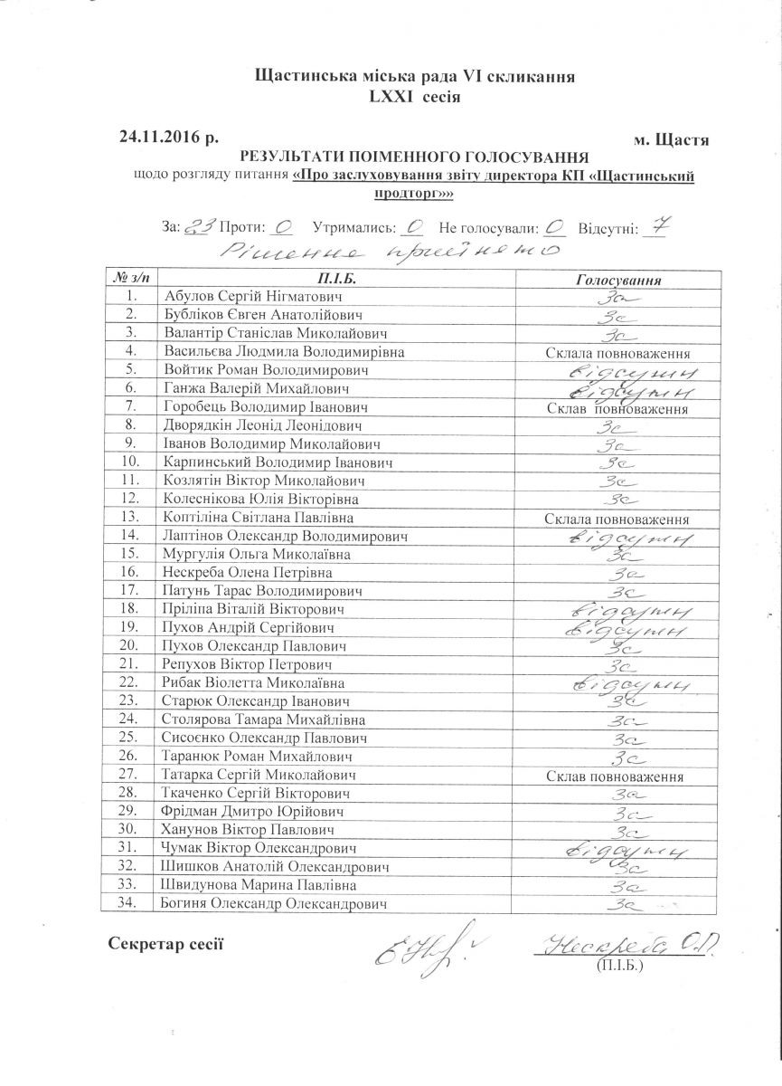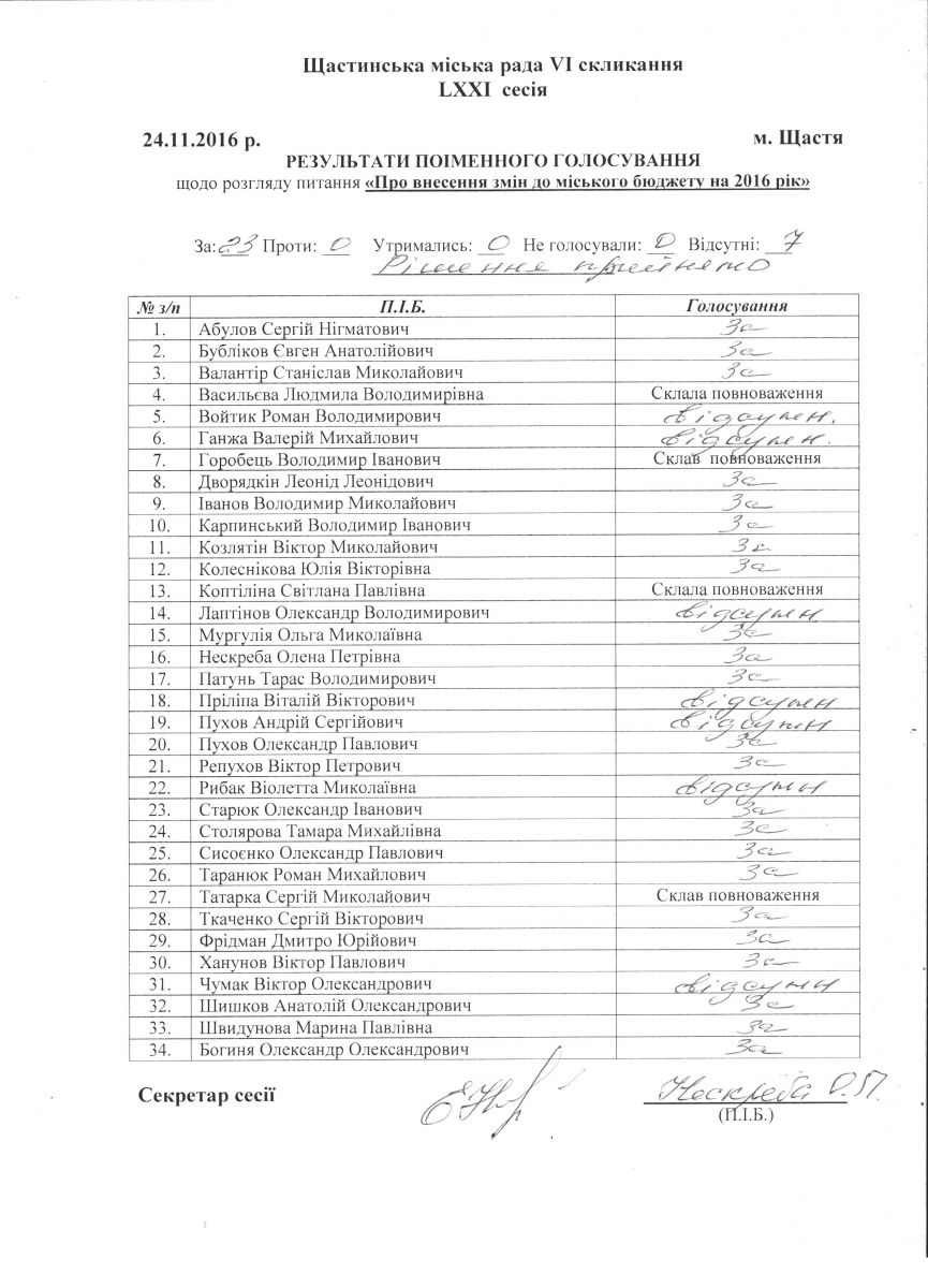 Результати поіменного голосування Щастинської міської ради VI скликання LXXI сесія