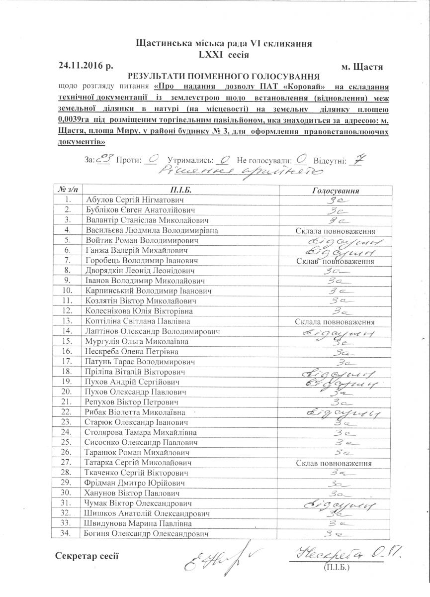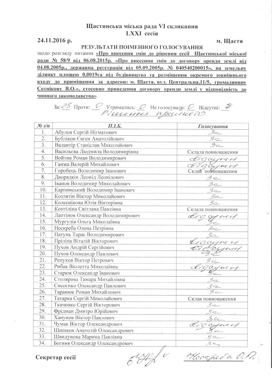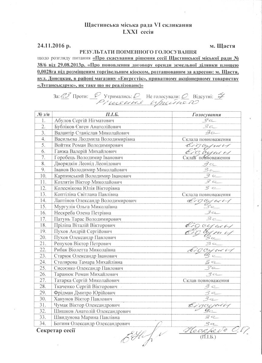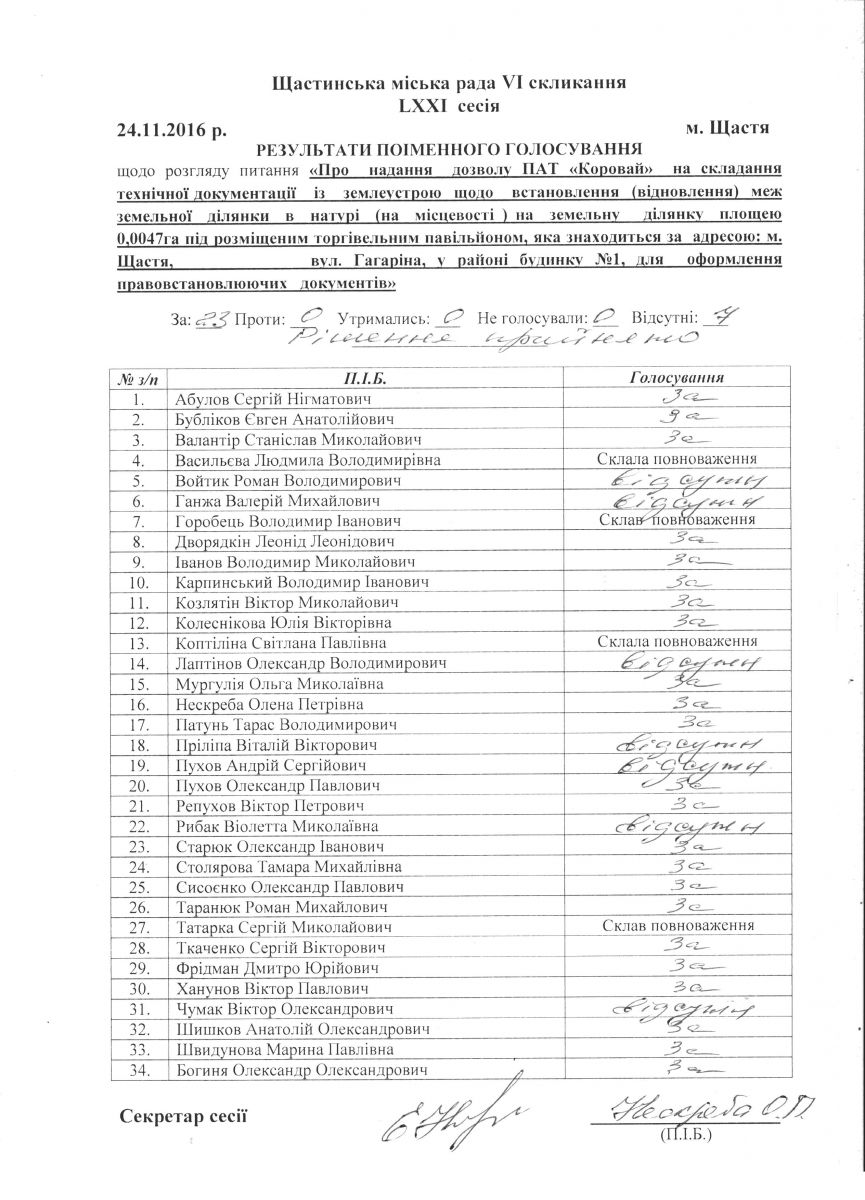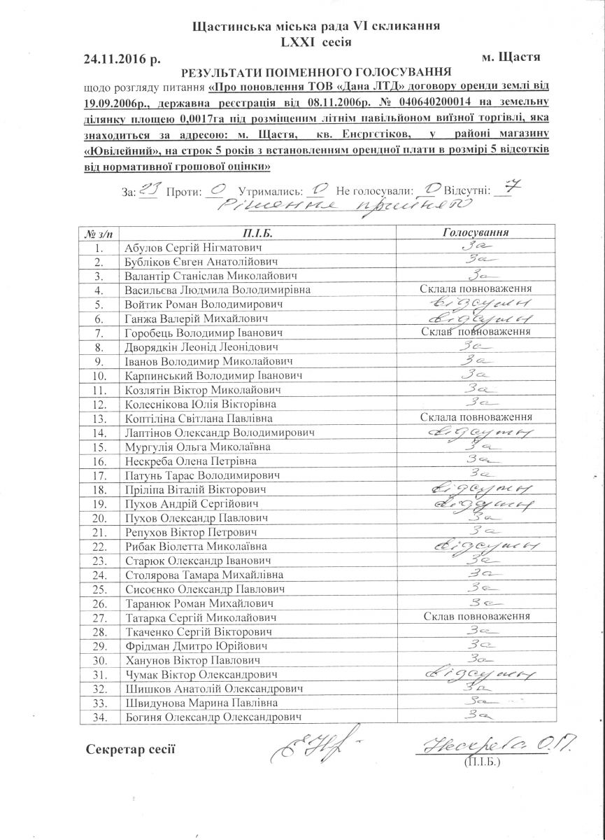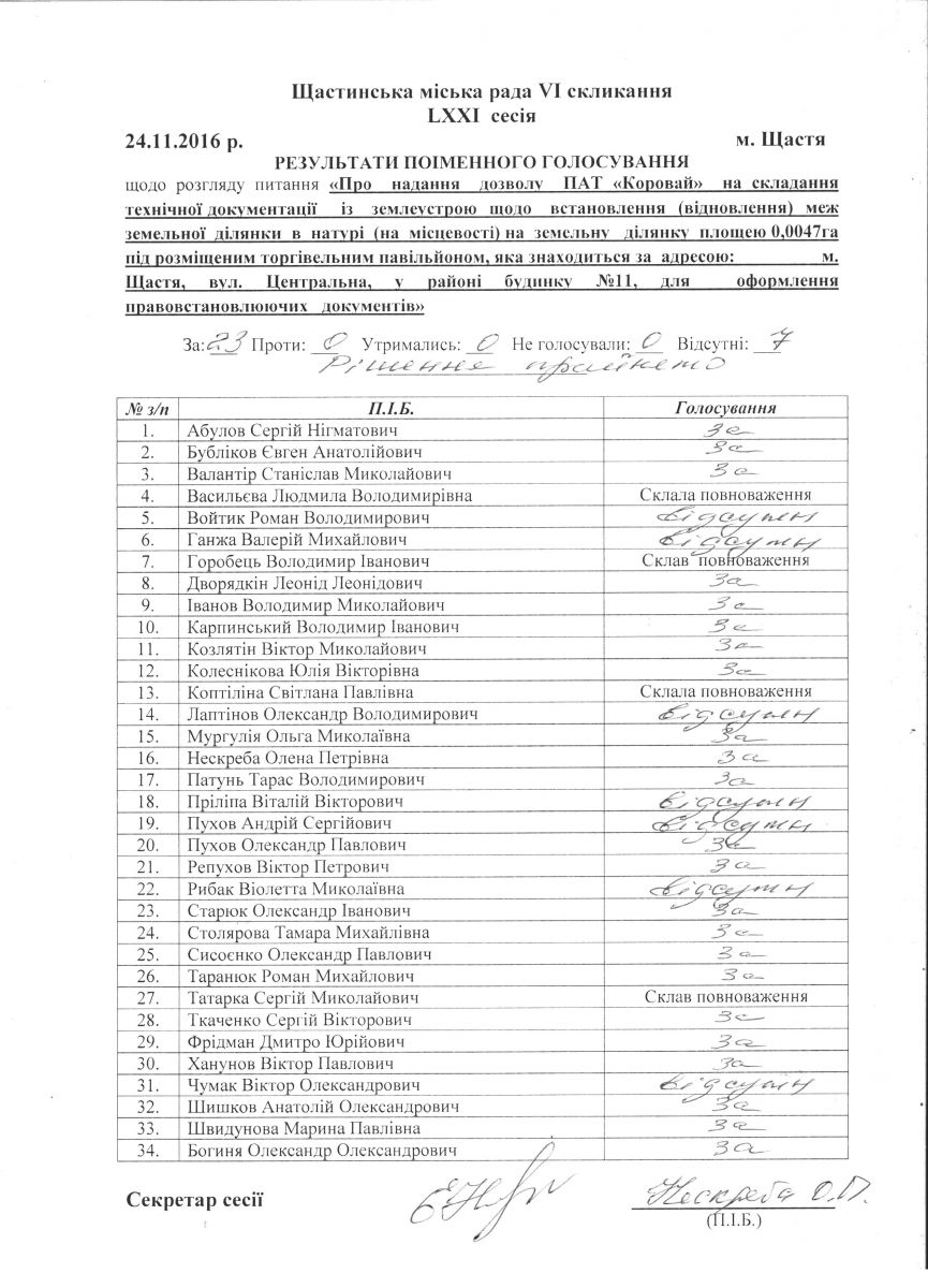 Результати поіменного голосування Щастинської міської ради VI скликання LXXI сесія