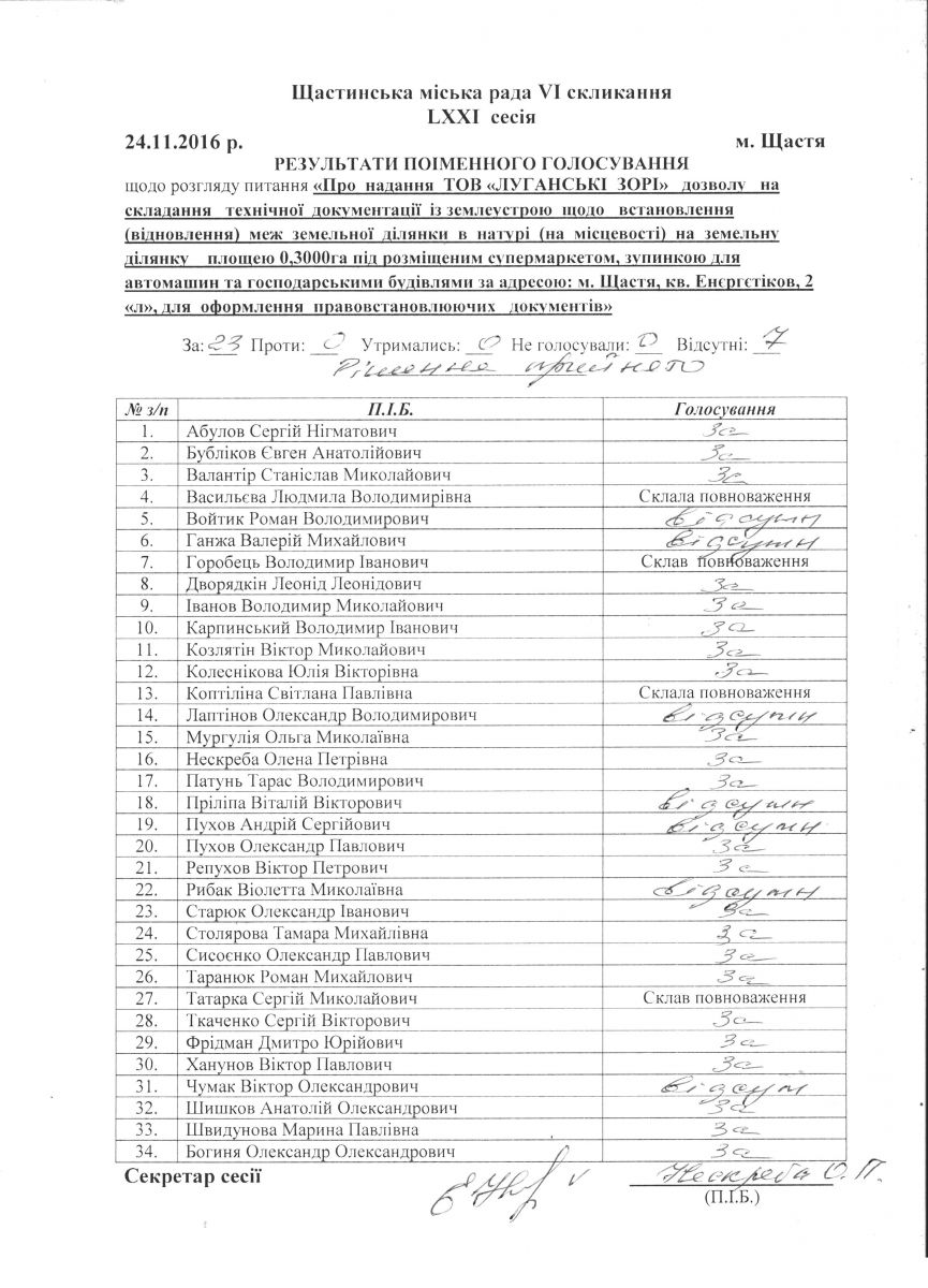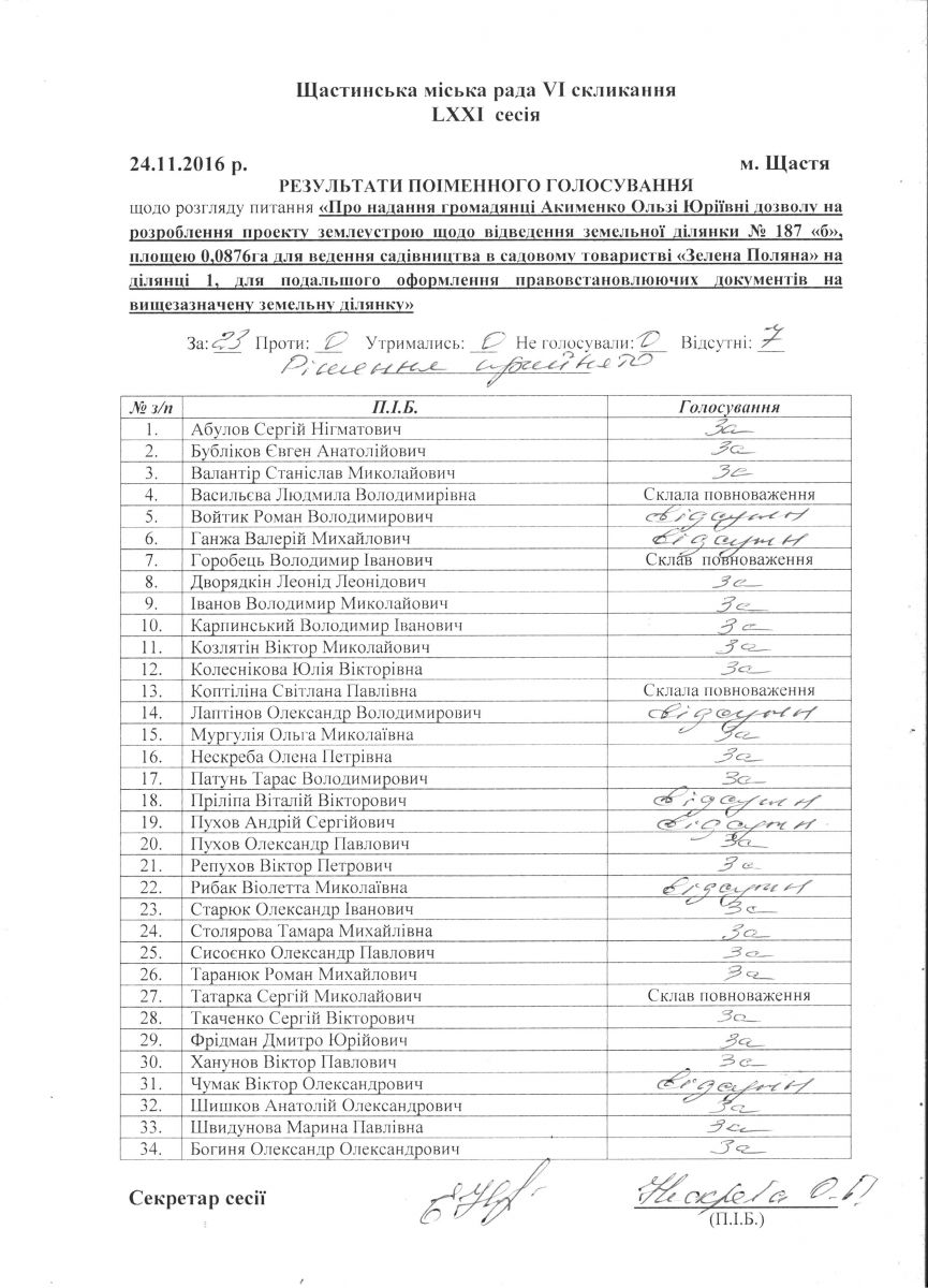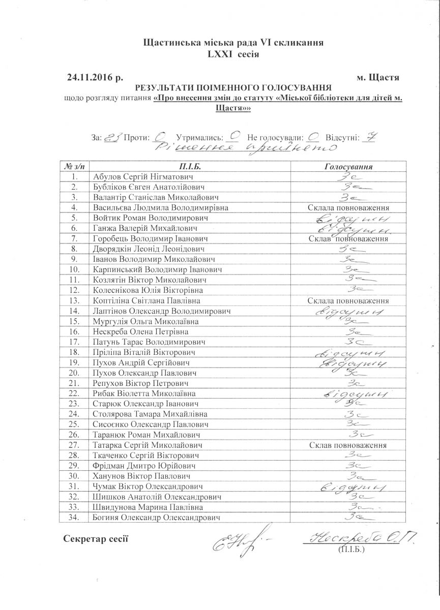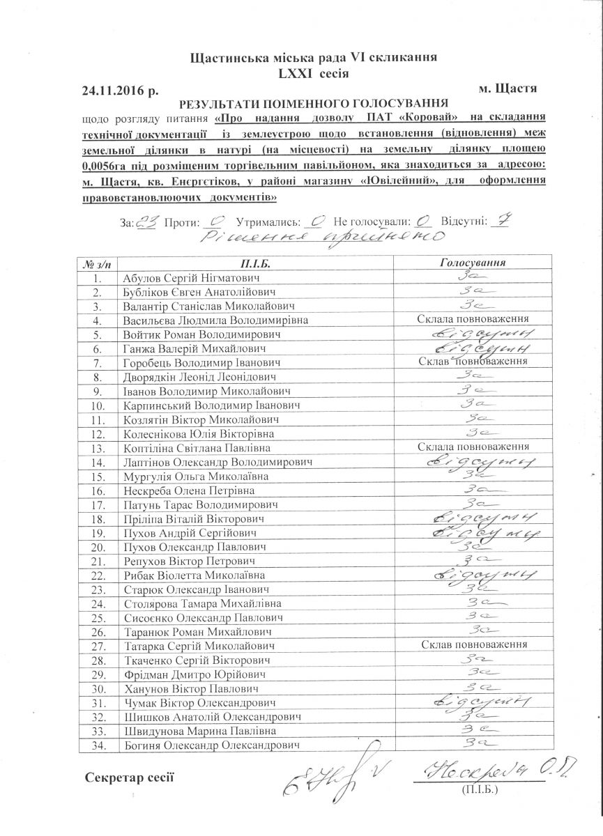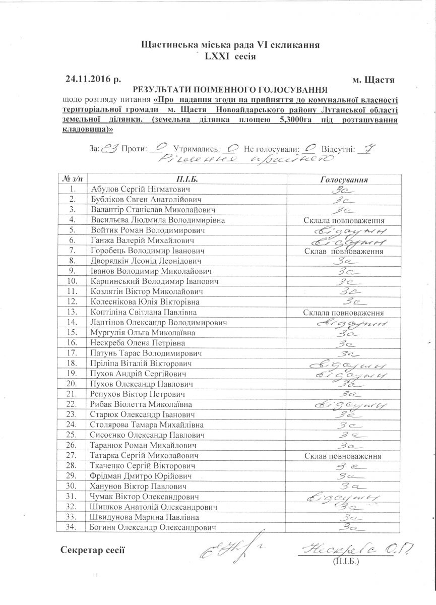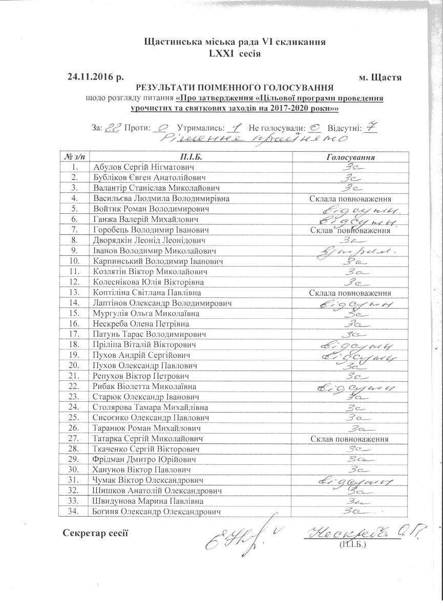 Результати поіменного голосування Щастинської міської ради VI скликання LXXI сесія