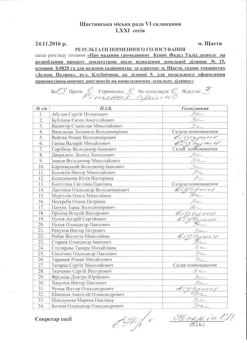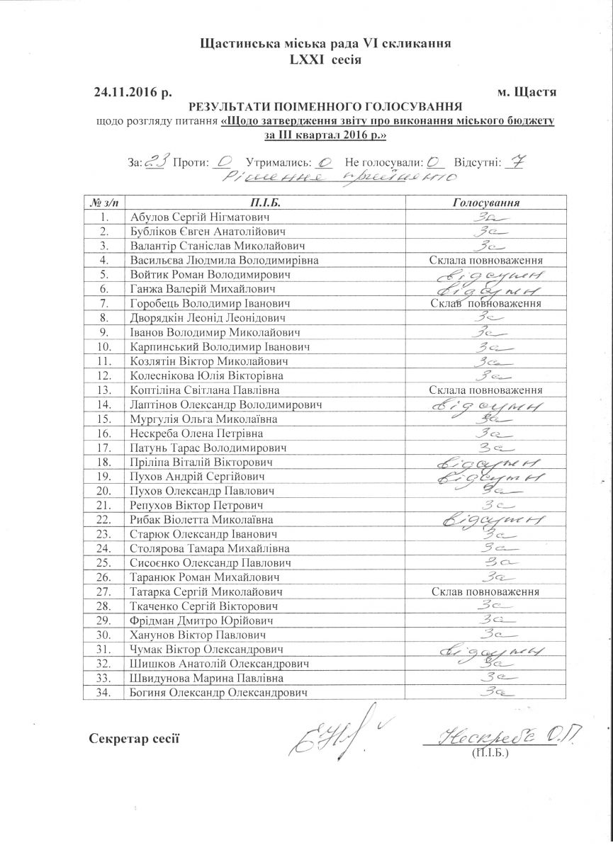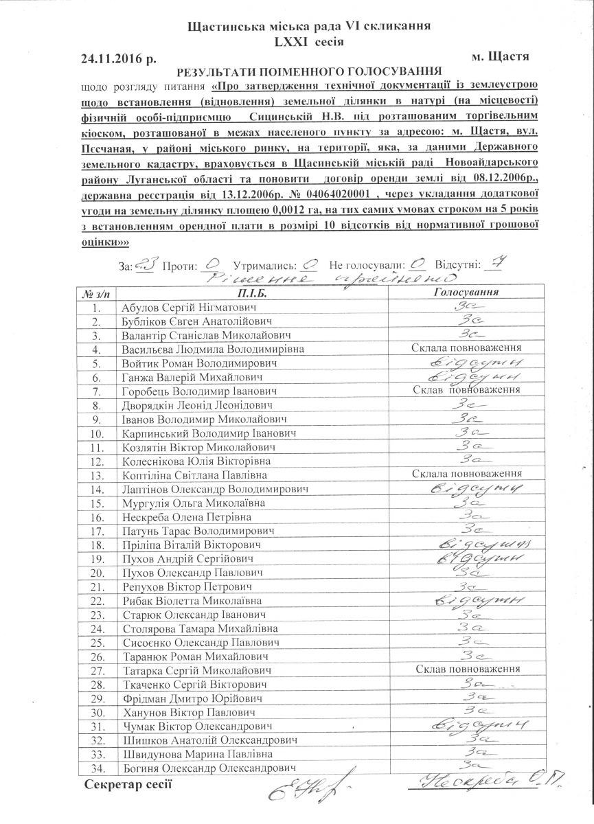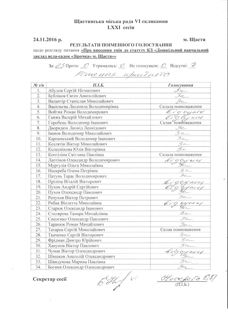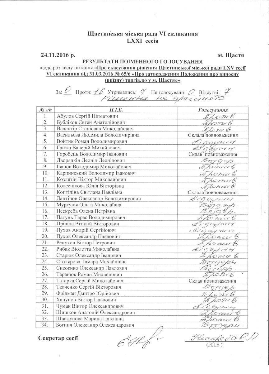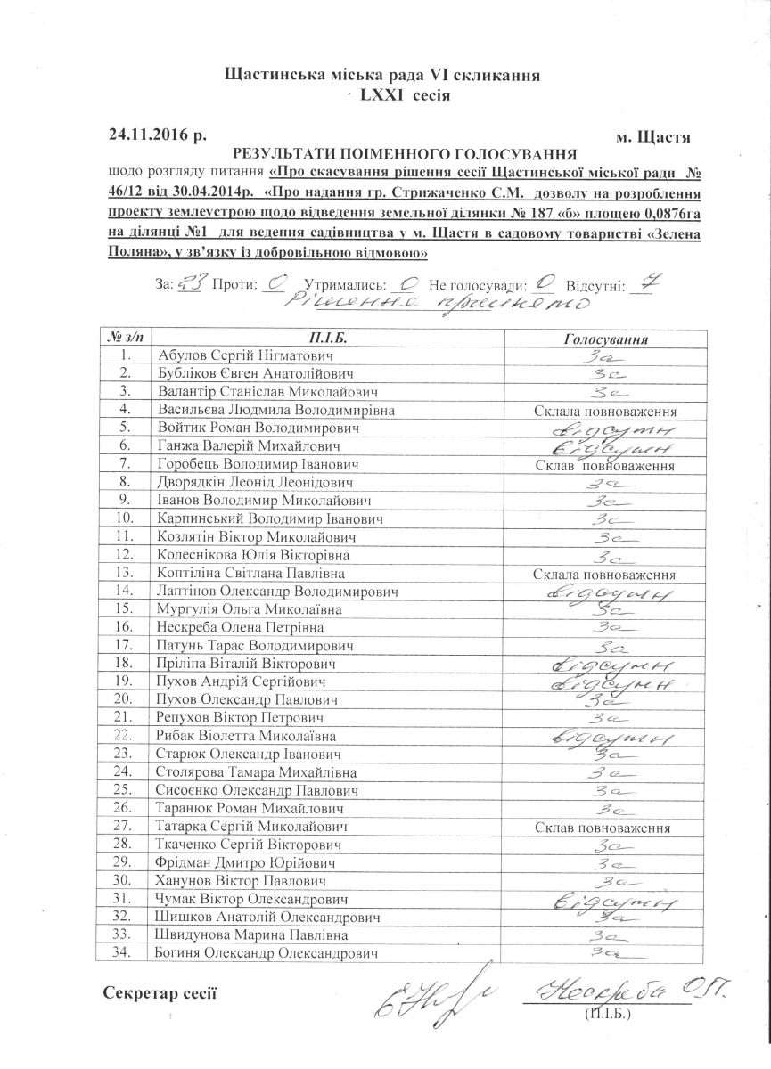 Результати поіменного голосування Щастинської міської ради VI скликання LXXI сесія