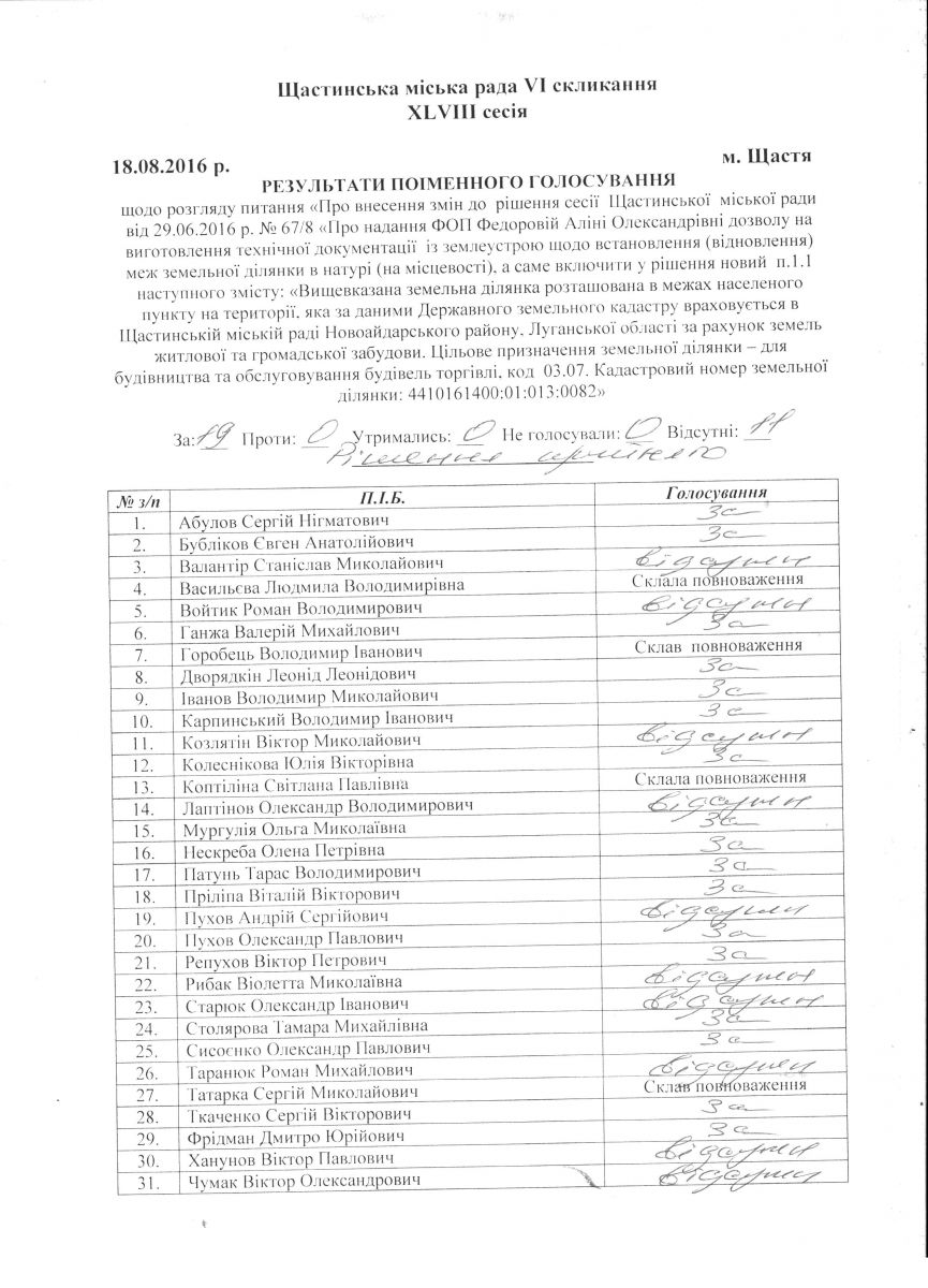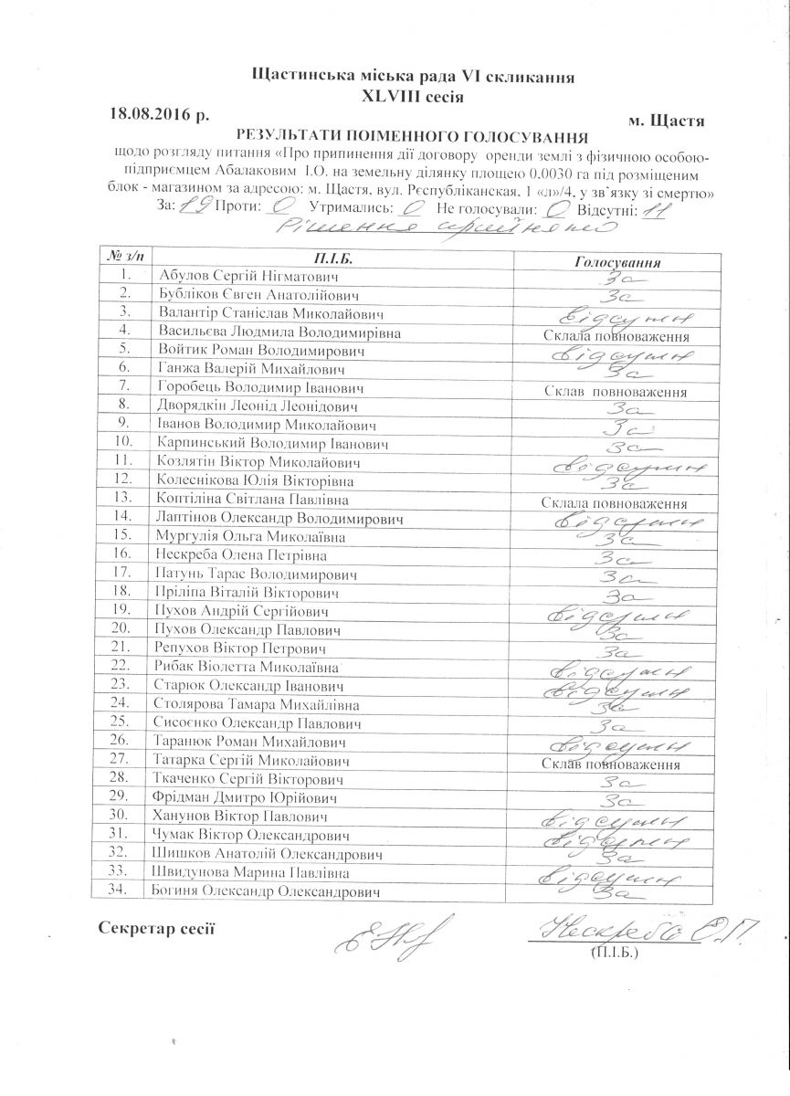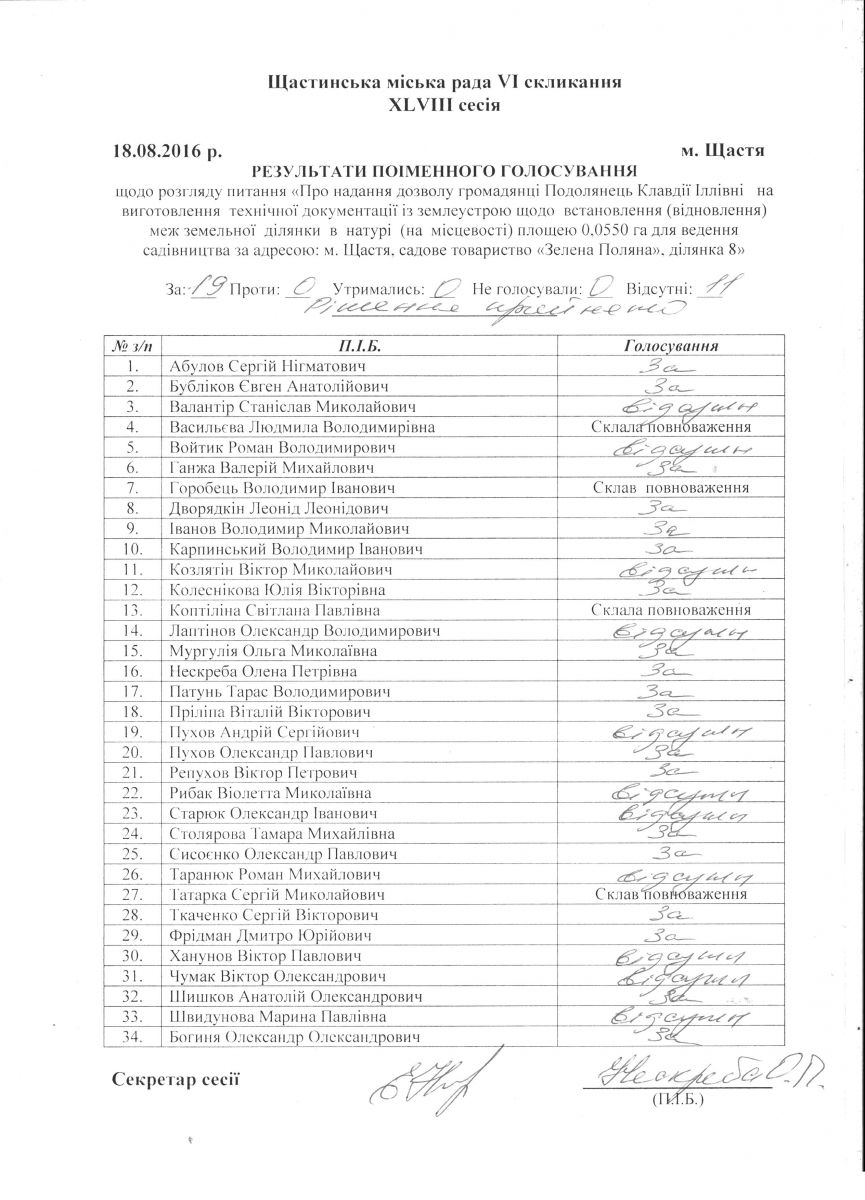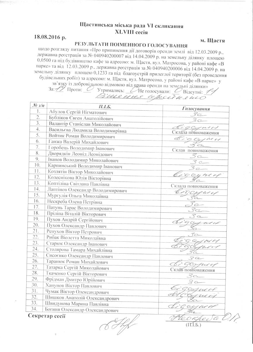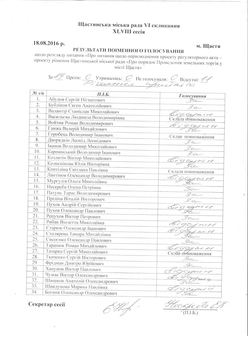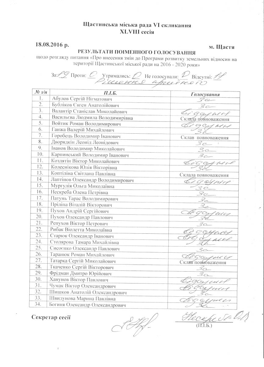 Результати поіменного голосування Щастинської міської ради VI скликання XLVIII сесія