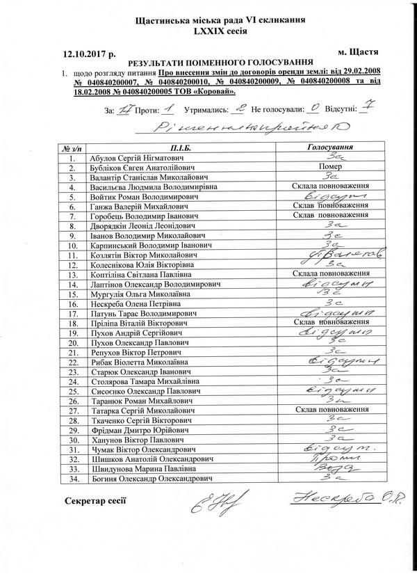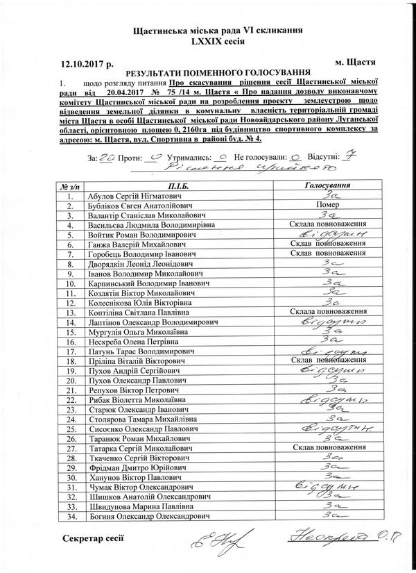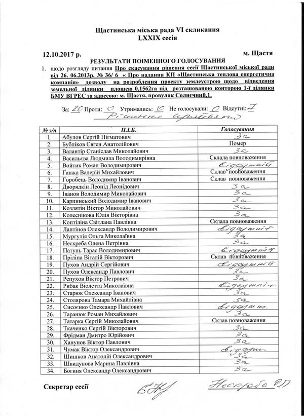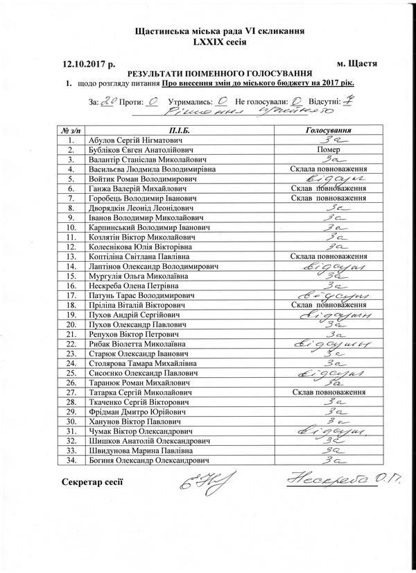 Результати поіменного голосування Щастинсьска міська рада VI скликання LXXIX сесія