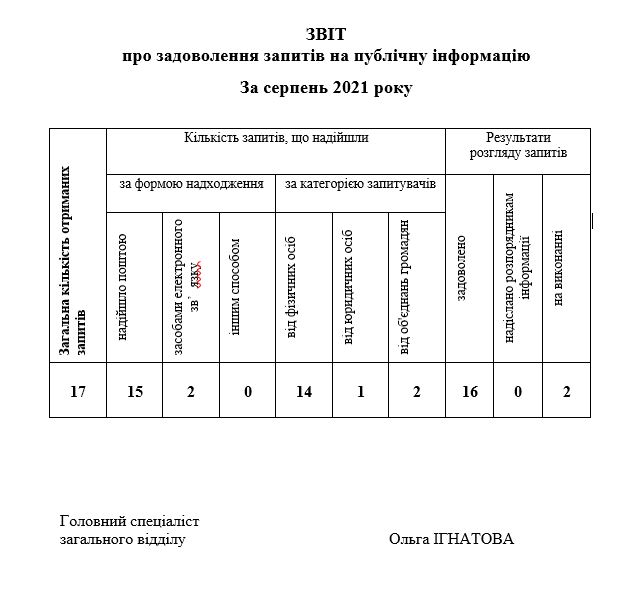 > ЗВІТ про виконання запитів на публічну інформацію за серпень 2021 року