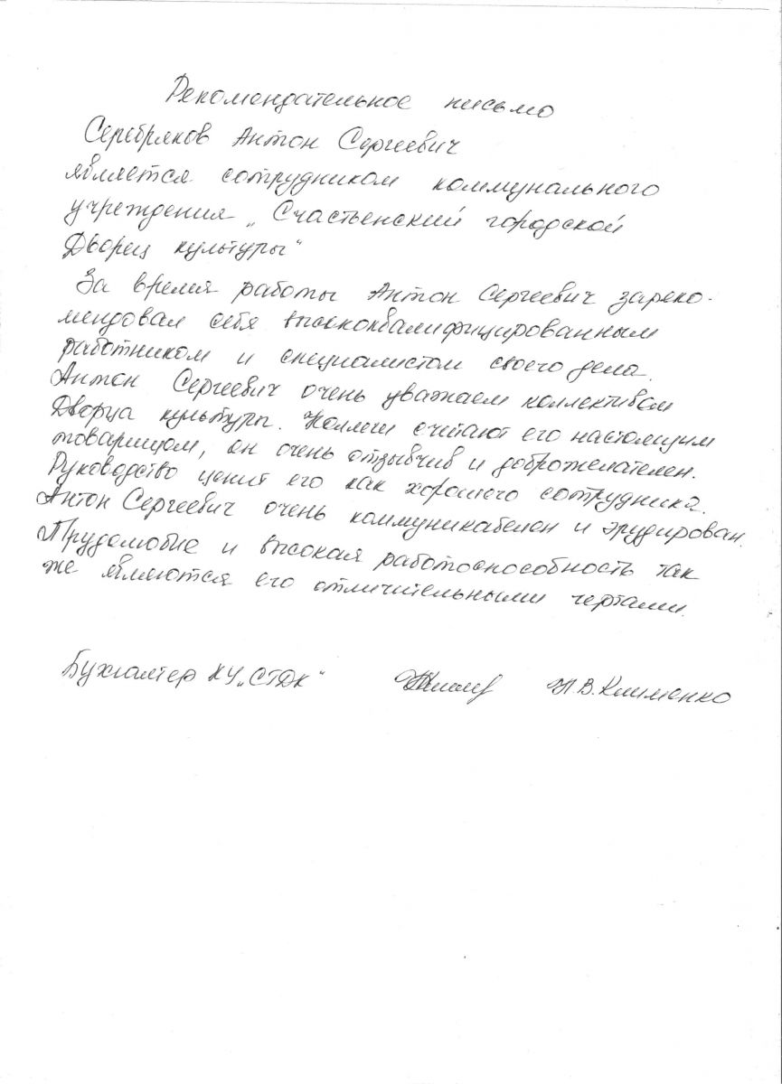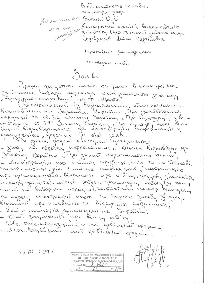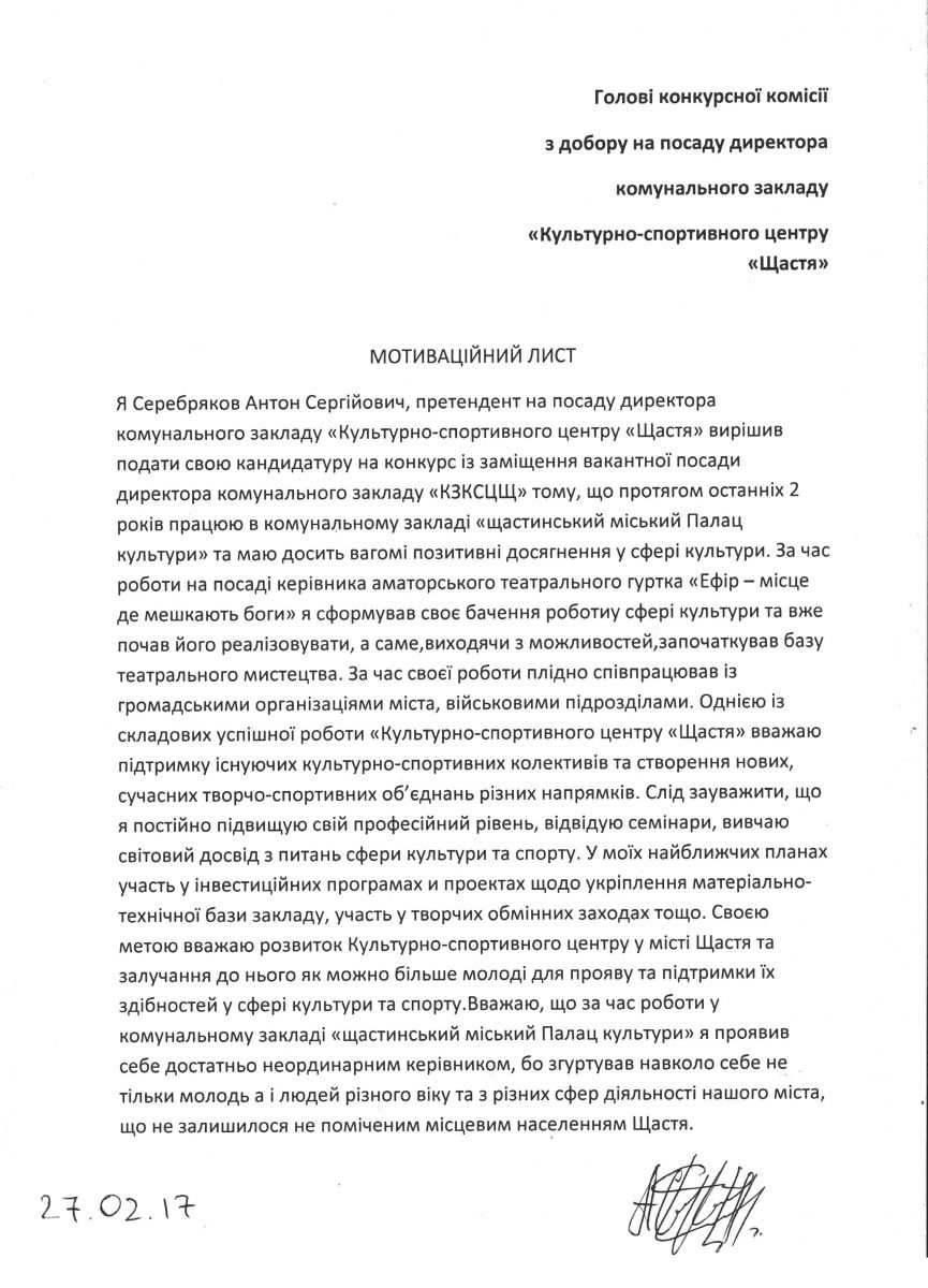 Серебряков А.С. - кандидат на посаду директора КЗ «Культурно-спортивний центр «Щастя»