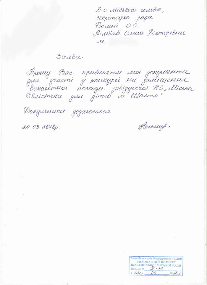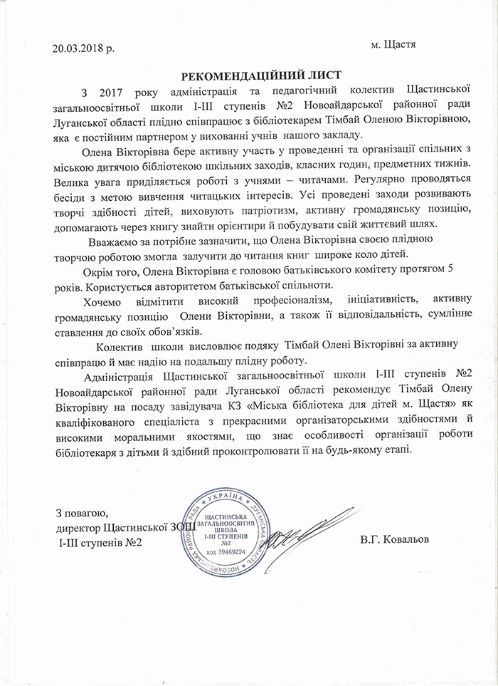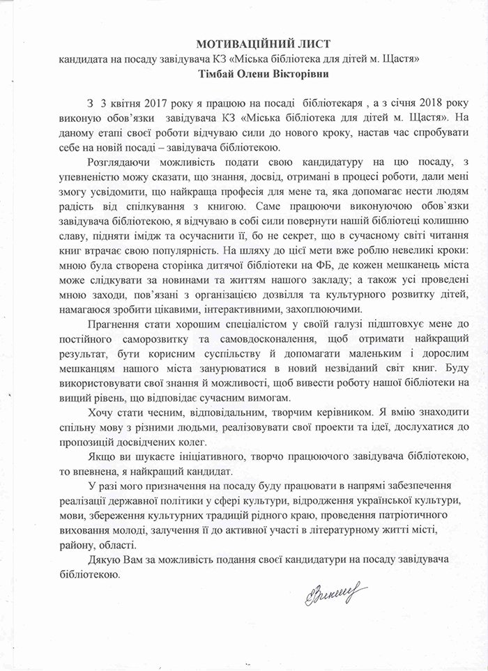 Тімбай О.В. - кандидат на посаду керівника комунального закладу «Міська бібліотека для дітей м. Щастя»