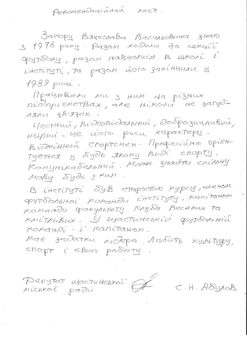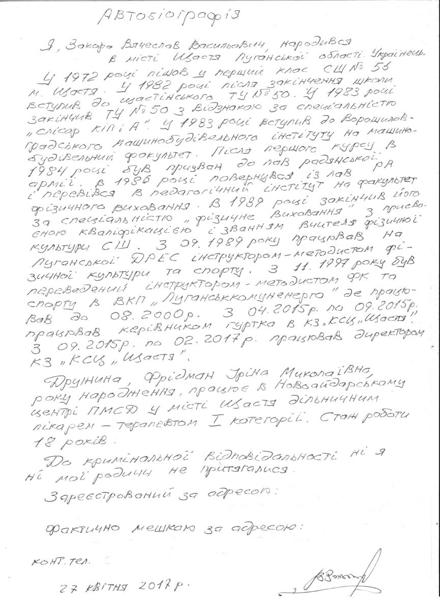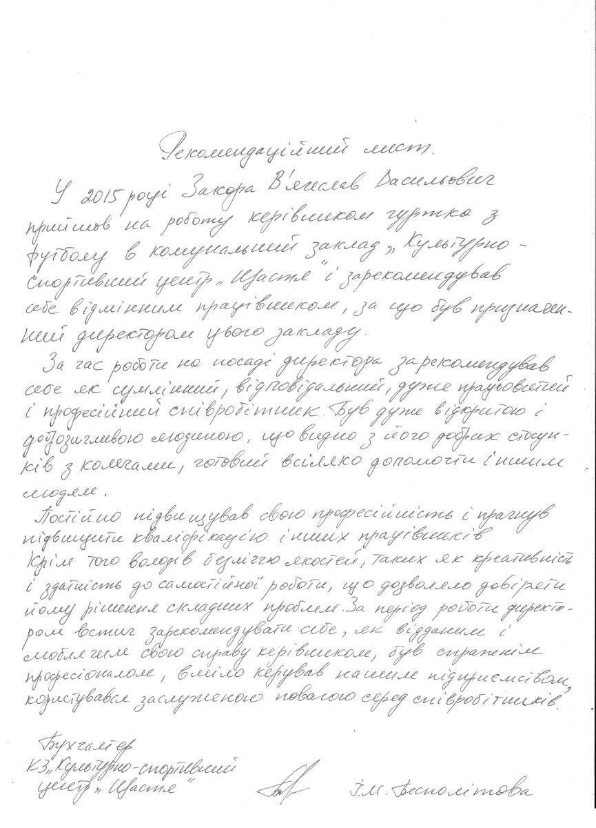 Закора В.В. - кандидат на посаду директора КЗ «Культурно-спортивний центр «Щастя»